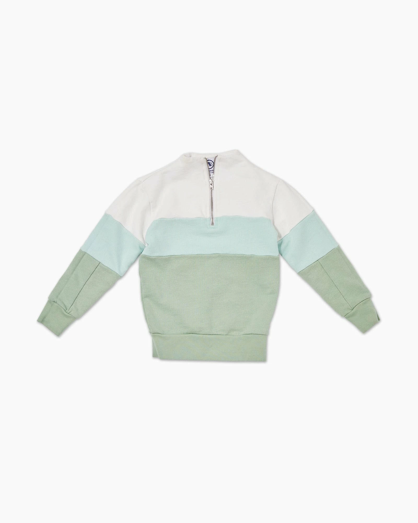 - Collared quarter zip pullover with rib cuff, band and color blocking.