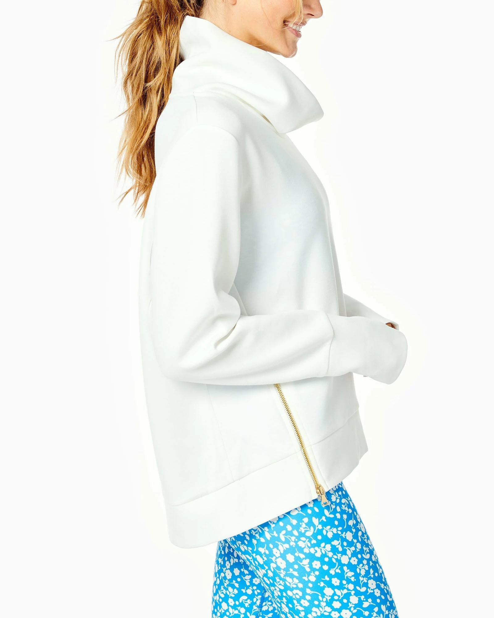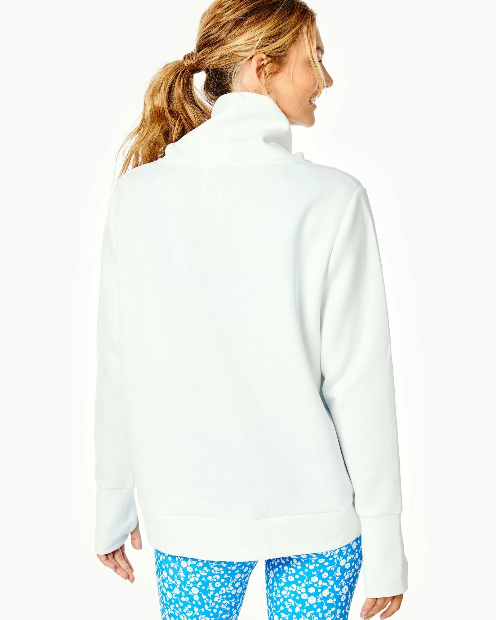 - Features a pull on style, mock neck, zippers, and thumb holes at sleeves.