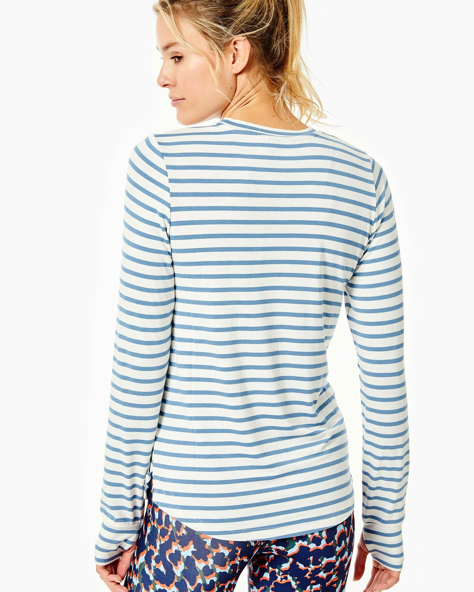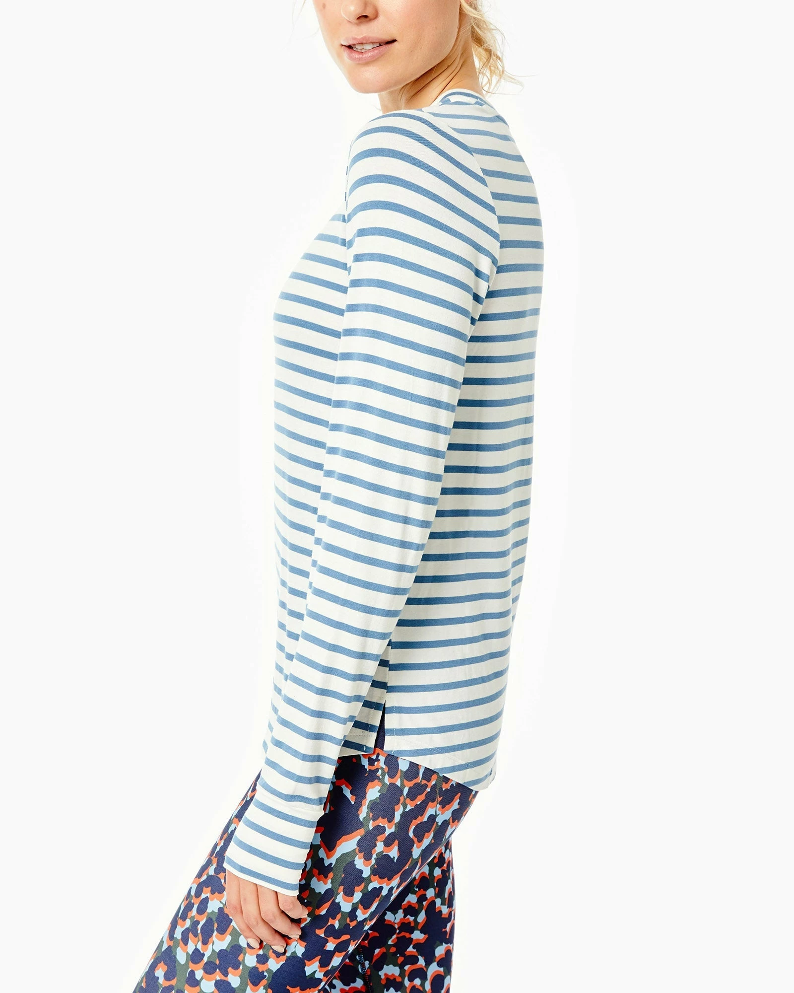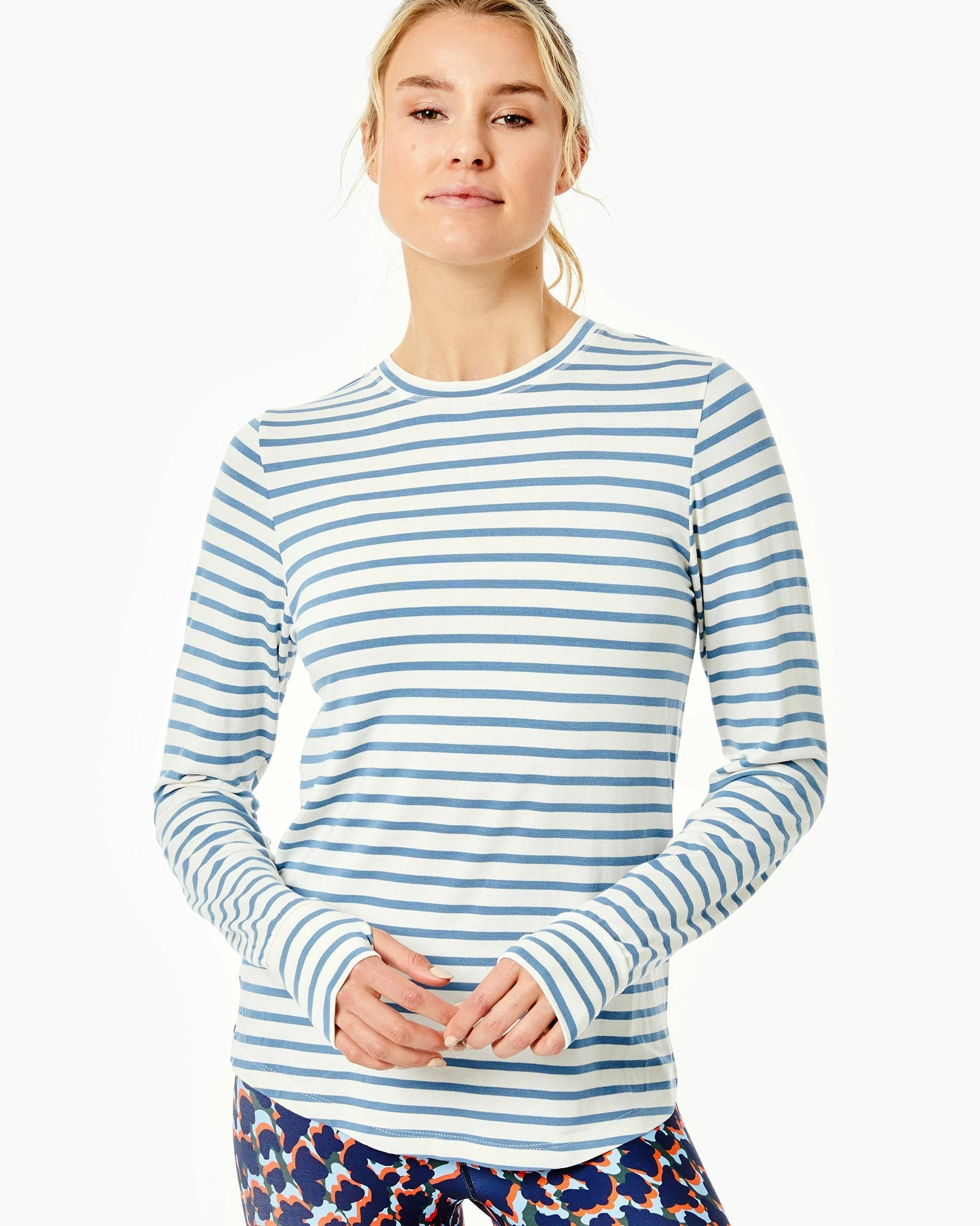 - Crewneck, curved hem with side slits, long sleeve with thumbhole cuff.