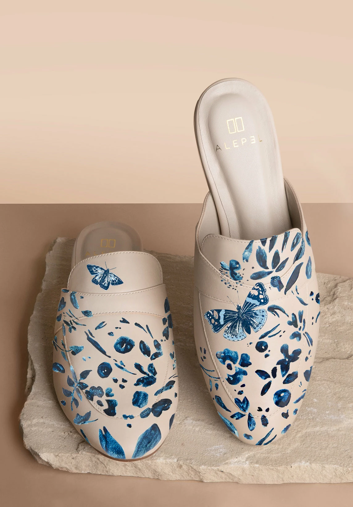 Introducing our Beige Mule Collection, our Denim Butterfly mule is inspired by a watercolor painting aesthetic and enhanced with realistic butterflies.