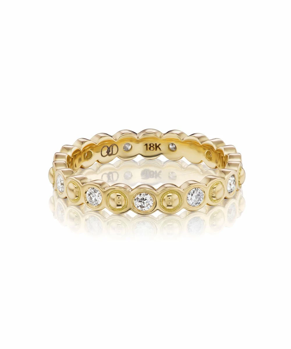 This ring is a part of their new Eyelet Collection. Inspired by raised dots often found in eyelet embroidery, this repeating pattern of circles feels classic and modern. Wear it alone or stacked in multiples for a more statement look.