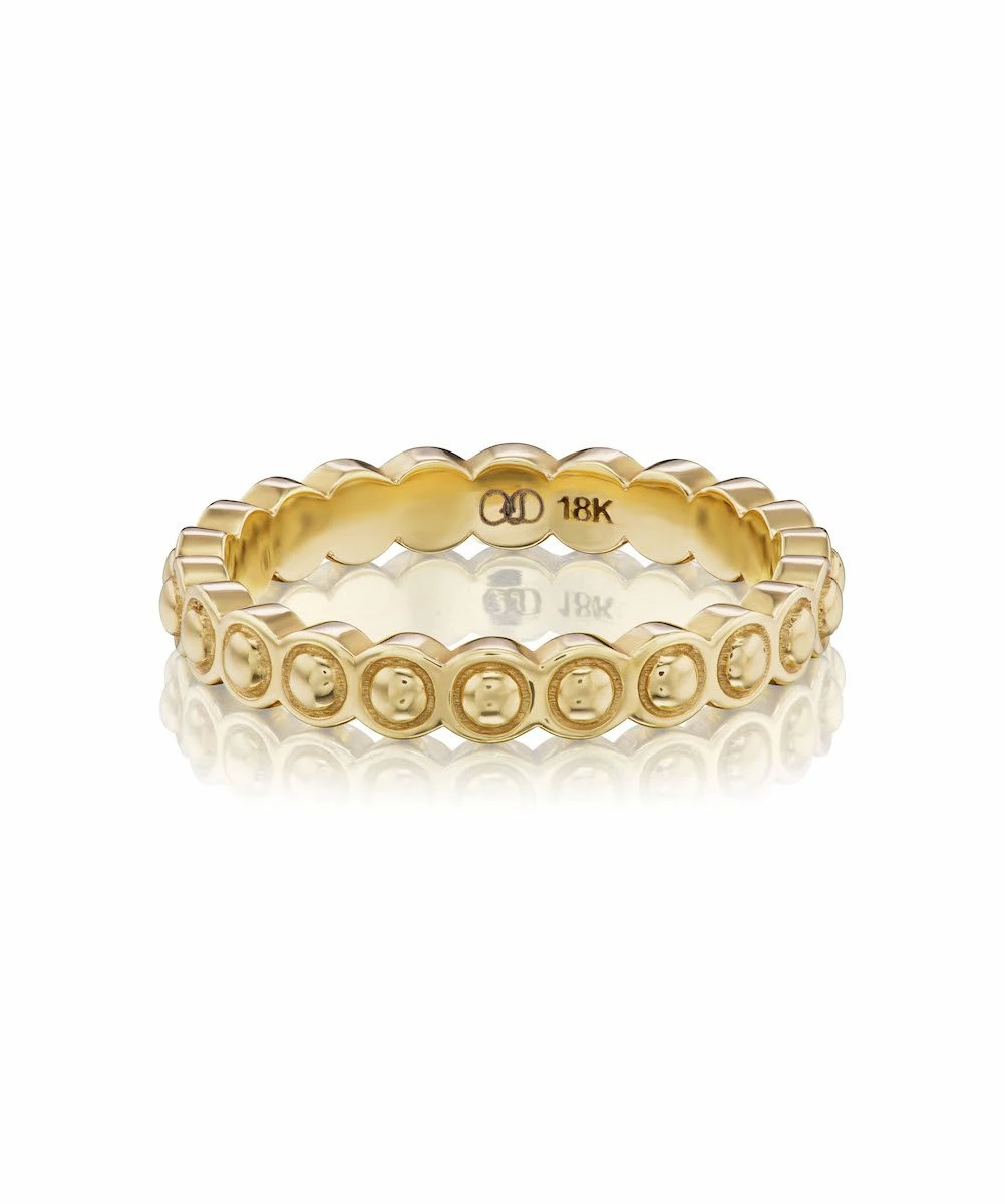 This ring is a part of their new Eyelet Collection. Inspired by raised dots often found in eyelet embroidery, this repeating pattern of circles feels classic and modern. Wear it alone or stacked in multiples for a more statement look.