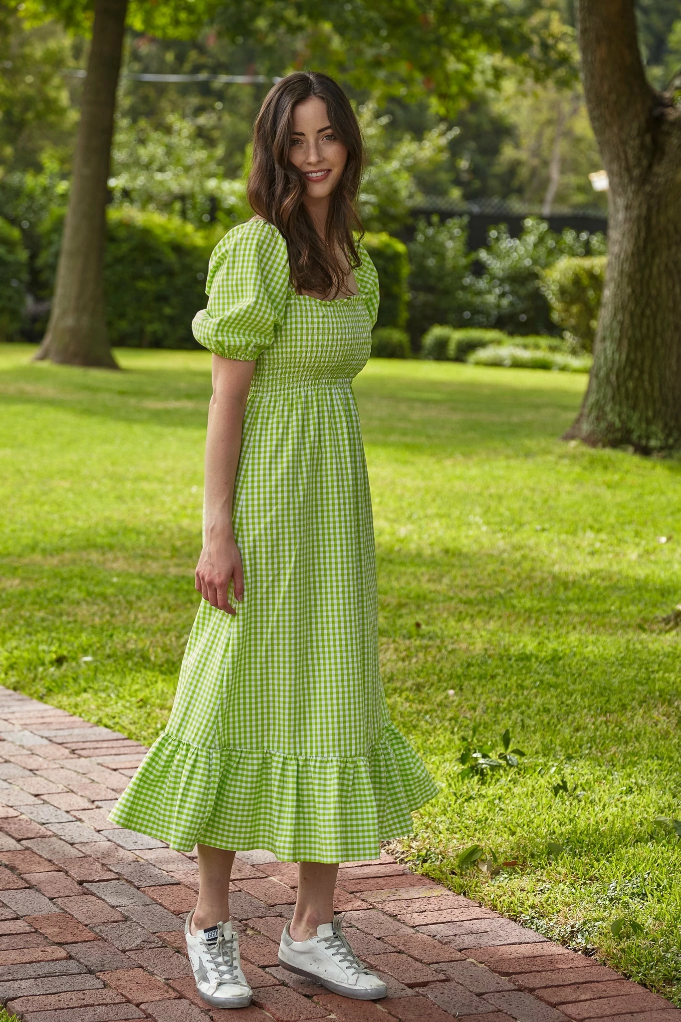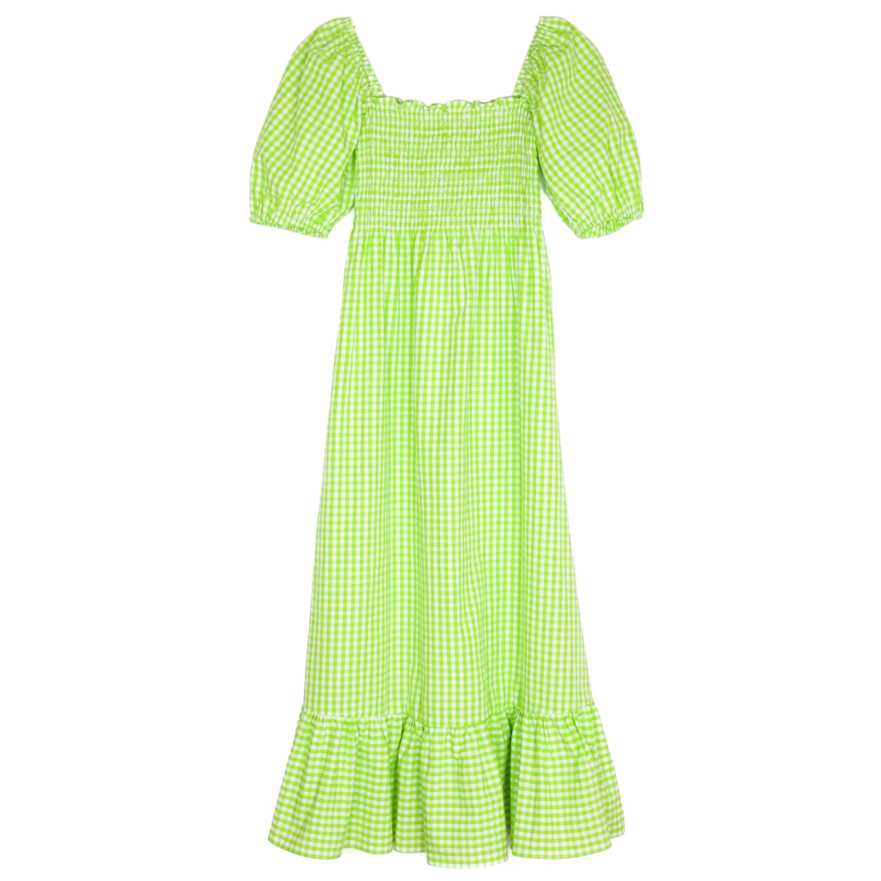 The Alice dress in green cotton poplin is the perfect transition dress. The loose elastic sleeve makes for a relaxed fit and can be worn either up or off the shoulder. Easily pairs with sandals or boots and a jacket for cooler temperatures.Â