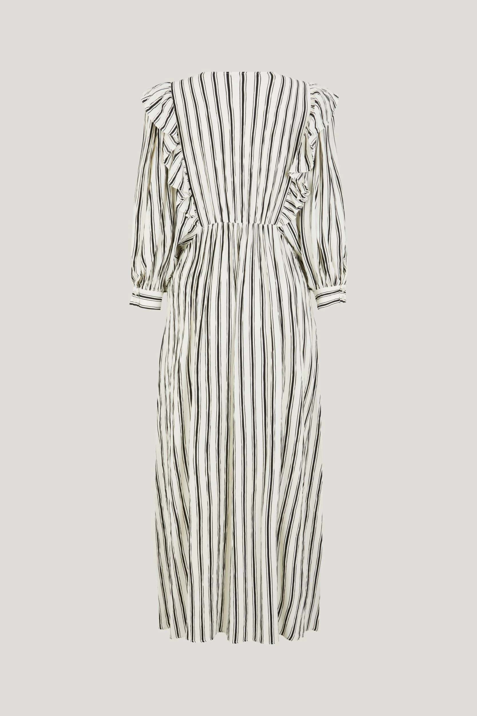 A maxi dress with three-quarter length, batwing sleeves with buttons at the ends. There are button closures with a keyhole opening at the front. The bodice has ruffles from the shoulders and down the sides to the waist.