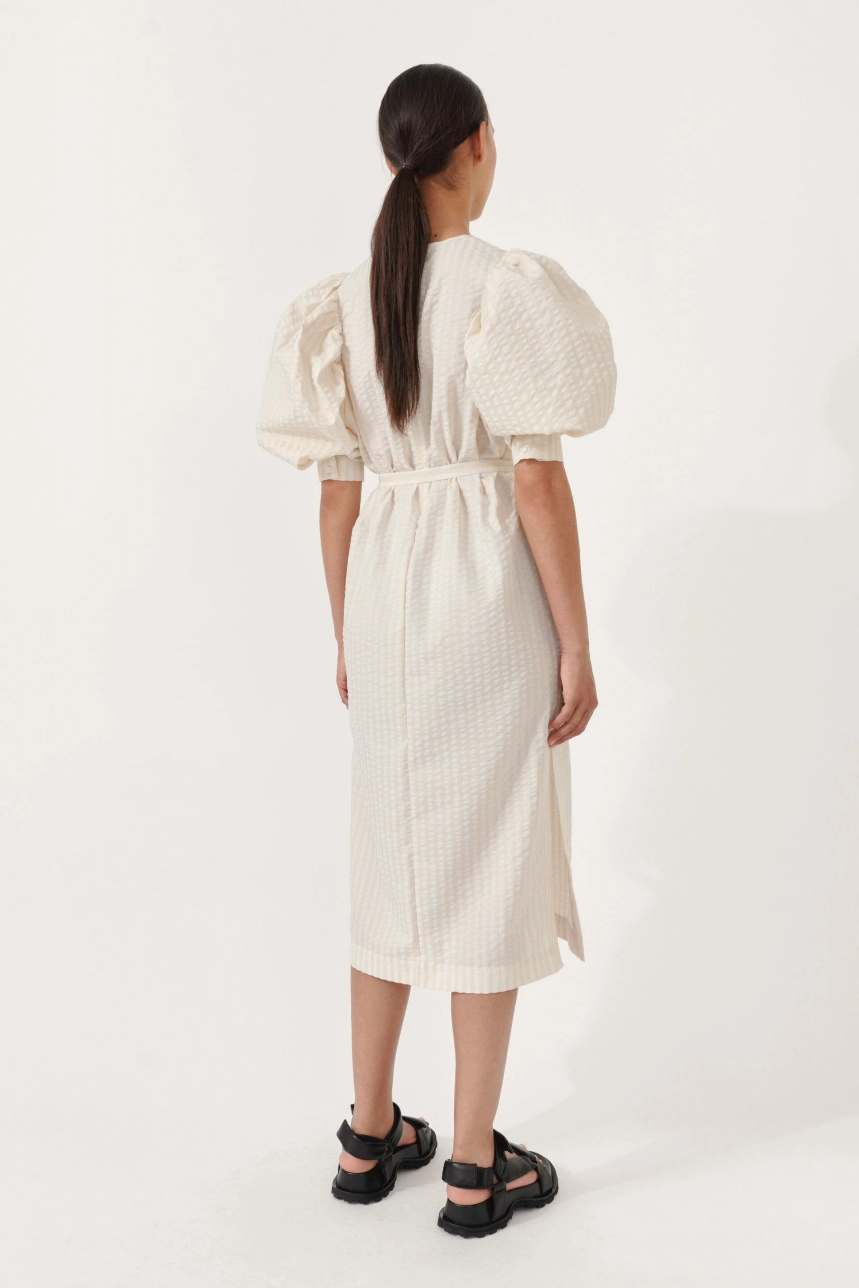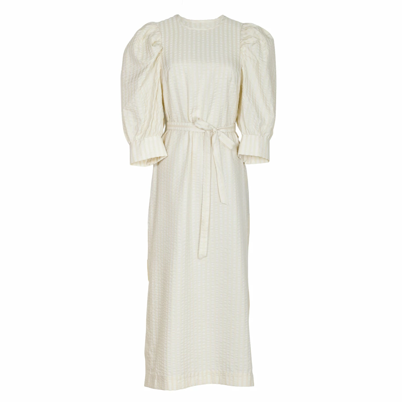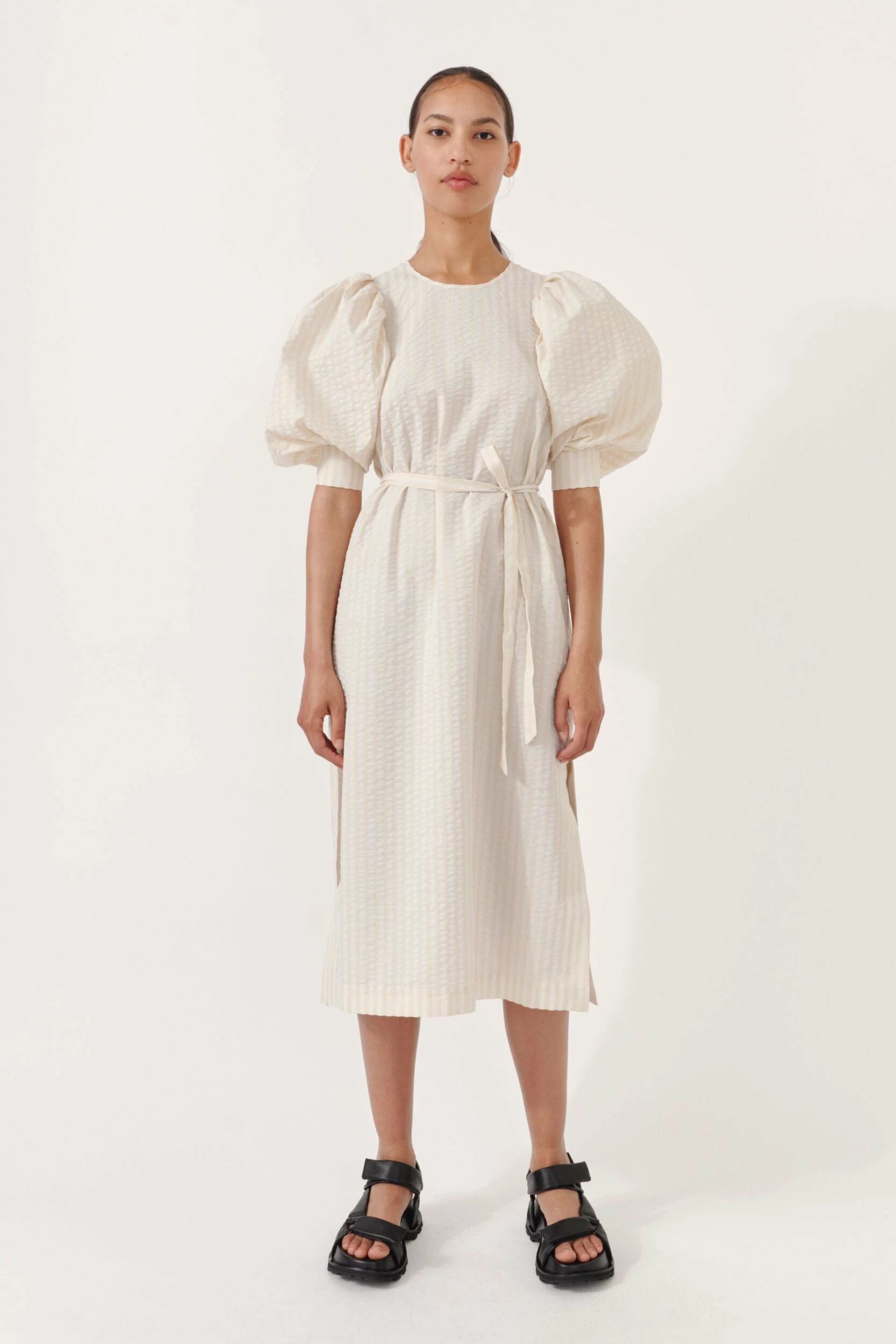 A midi-length, dress with puffed, three-quarter length sleeves and a tie at the waist. The dress features a zip closure at the back, slits at the sides, and has a regular fit. This dress is made from a cotton and recycled polyester blend.