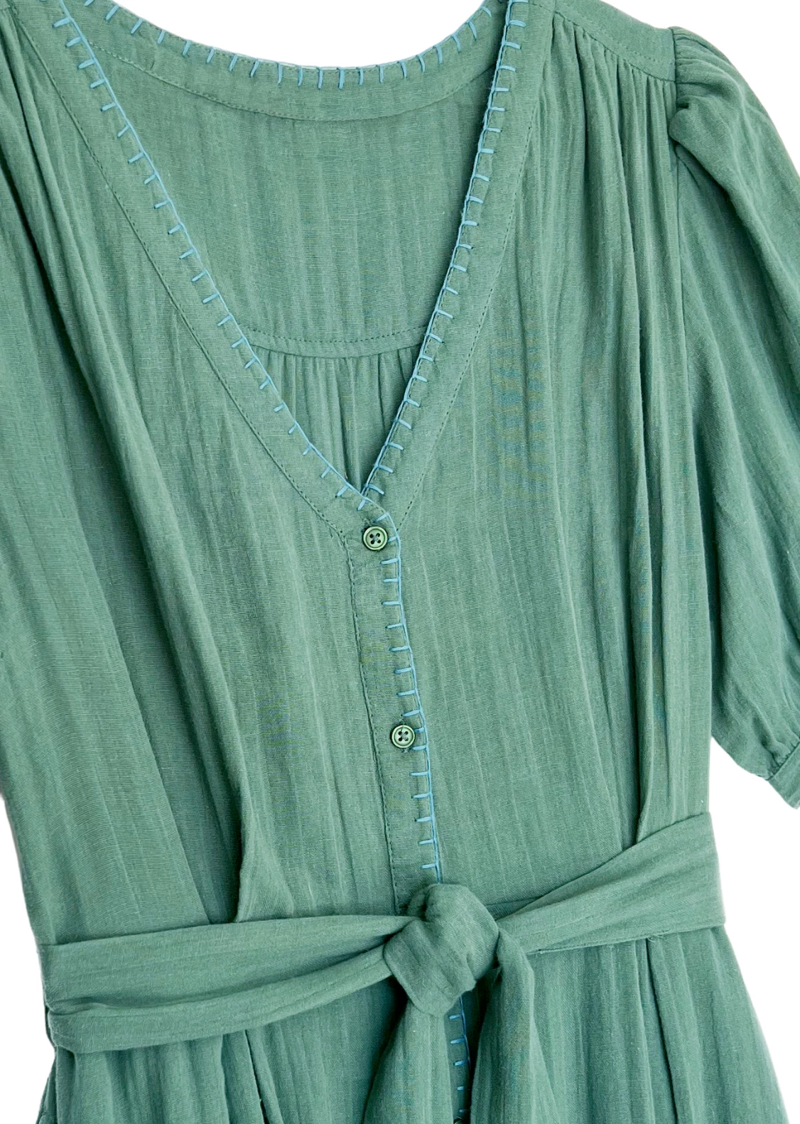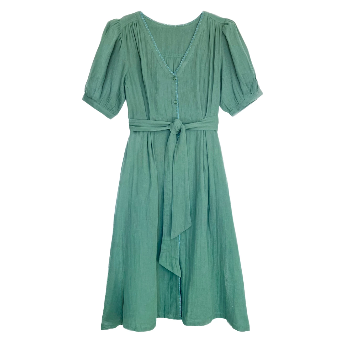 The Blaire Dress, which comes in a vibrant hedge green with blue blanket stitch detailing, delivers effortless, easy style. It’s the dress you’ll reach for when you’re racing out the door and want to look pulled together but don’t have the time or energy to spare. A full skirt and tailored pleats that nip in at the waist as well as an optional sash belt lend this classic midi-length shirt dress plenty of shape and movement. And a slightly puffed elbow-length sleeve adds a feminine touch.