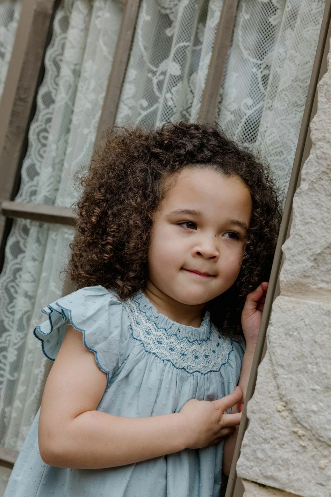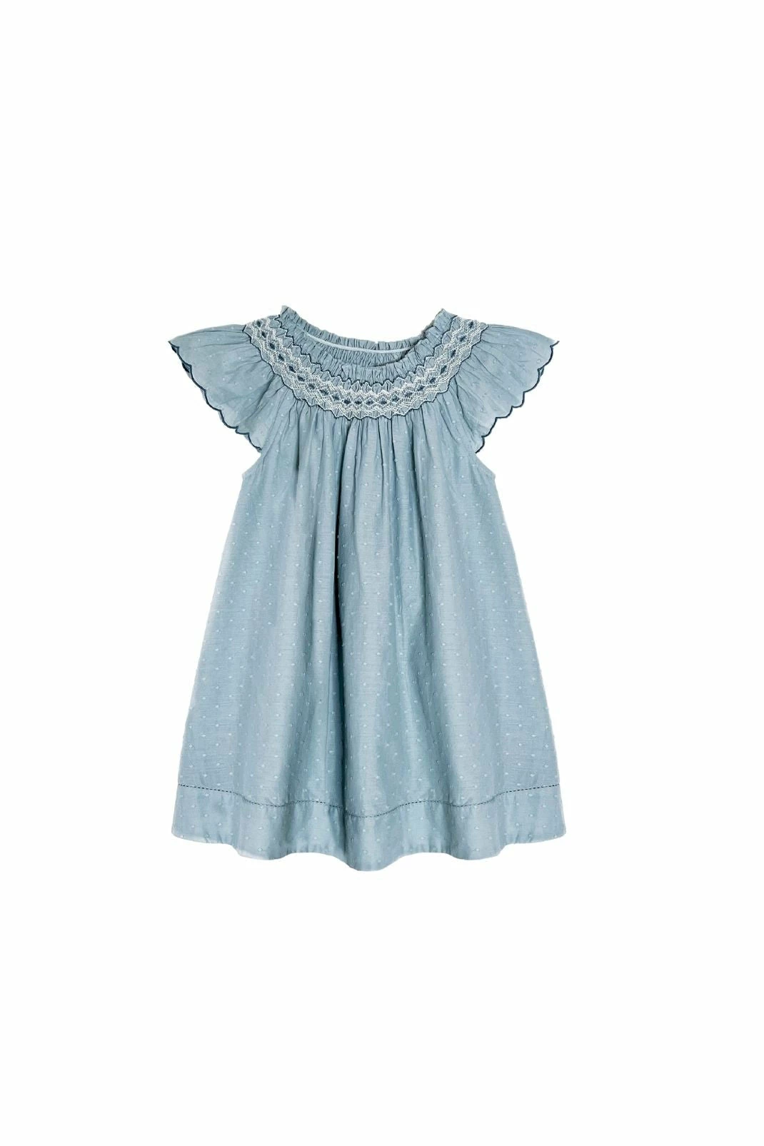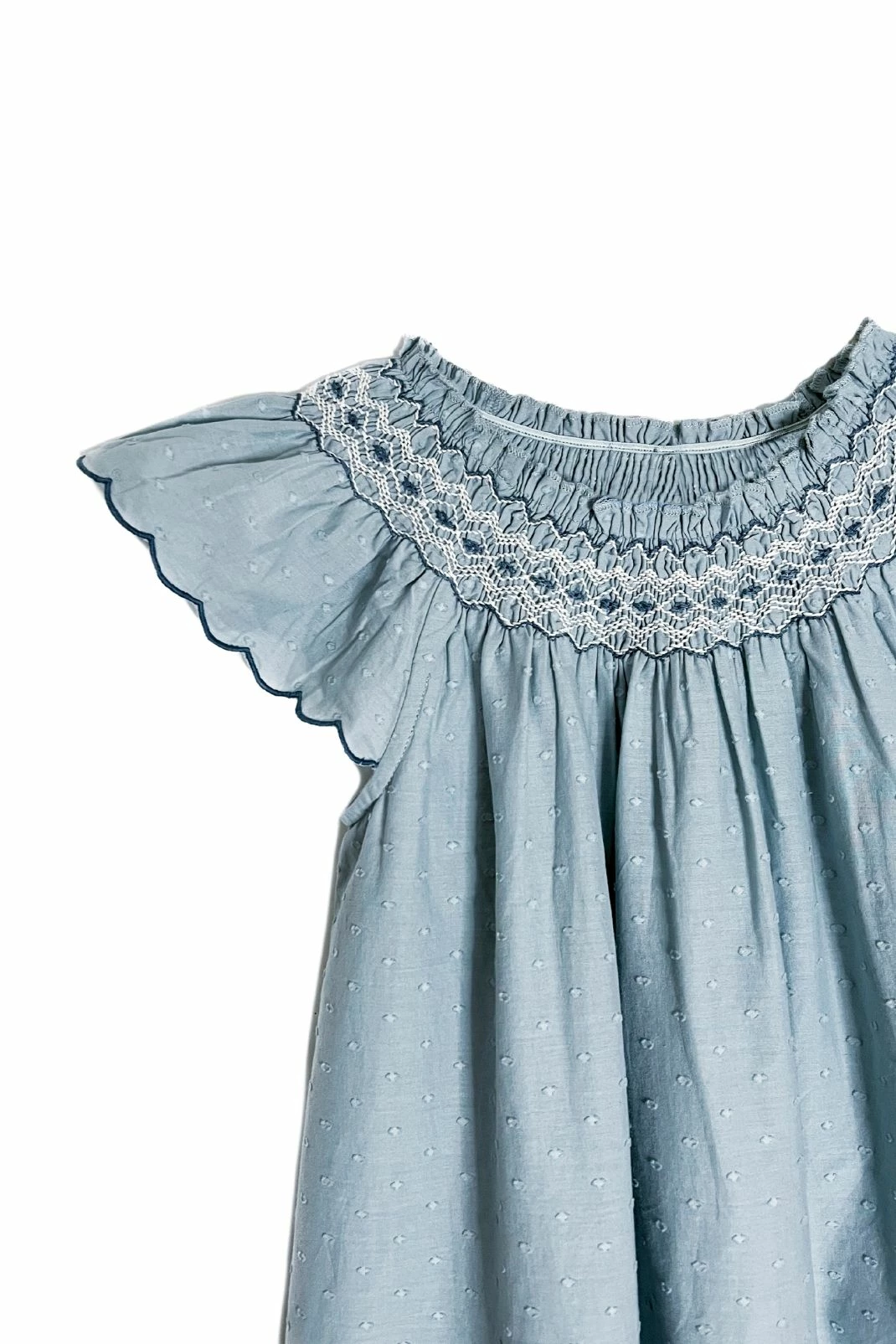 Made from a breezy Swiss dot fabric with classic blue-and-white hand-smocked details, scalloped flutter sleeves, a swingy pull-over silhouette, and delicately ruffled neckline, the Daisy Dress in Pearl Blue delivers timeless warm weather style.