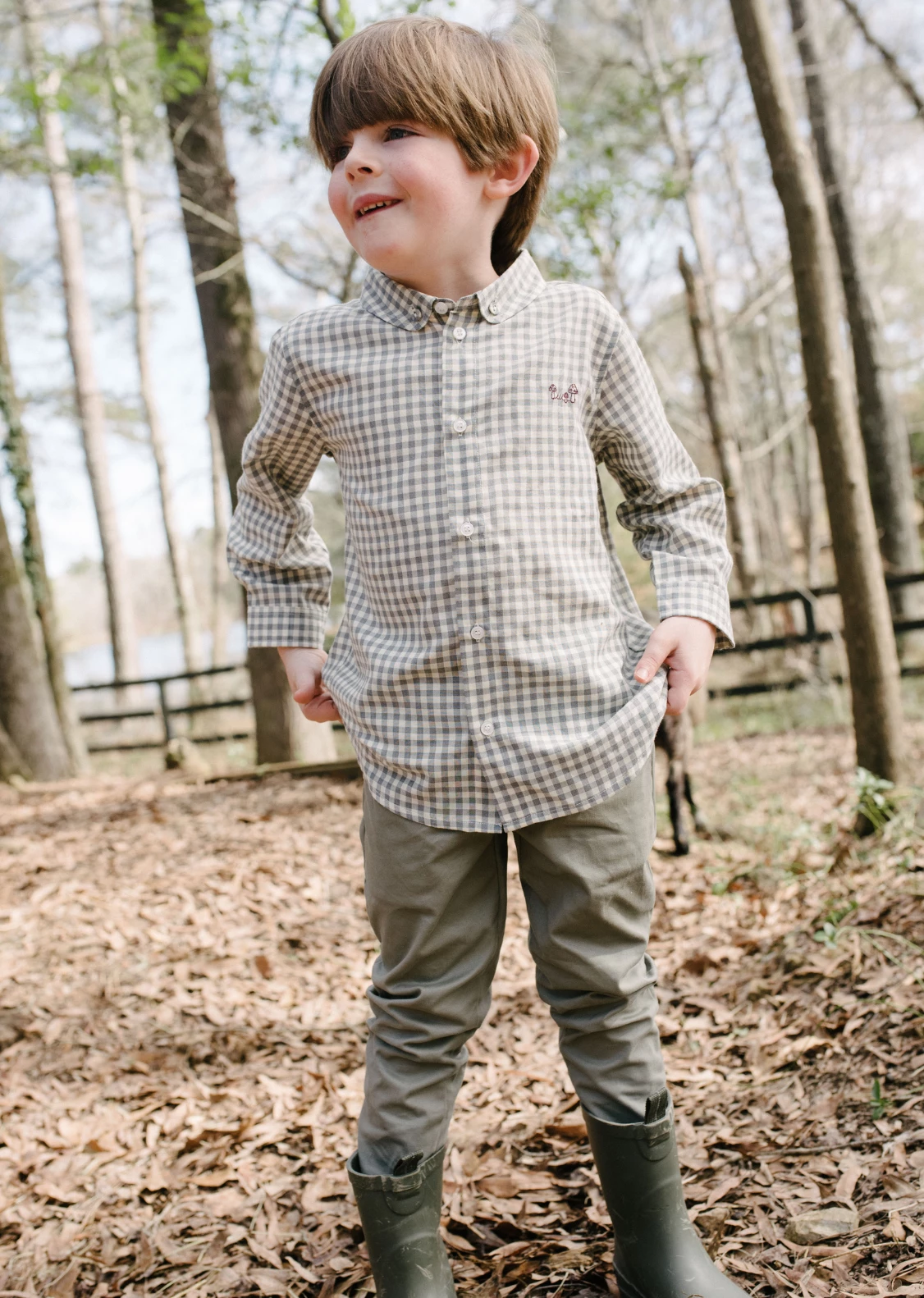 Easily one of the softest button-downs we’ve ever come across, this classic style in 100% cotton gingham adopts a bit of whimsy with its burgundy embroidered mushrooms. A top for boys that can be styled every which way at a comfort level he’ll approve of.