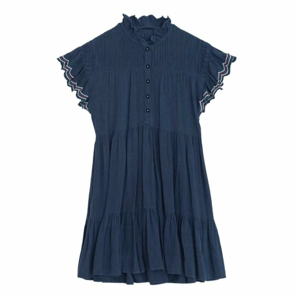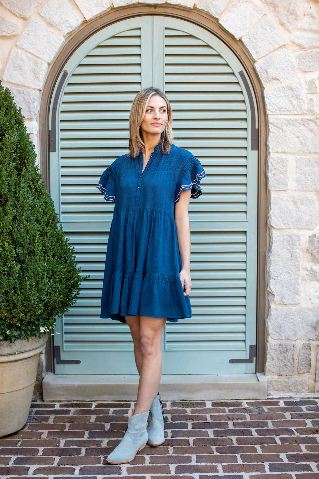 A stunning blue hue defines this swingy, easy-to-wear yet fabulously detailed silhouette. Vibrant scalloped embroidery in ruby and teal at the fluttery, drop shoulder sleeves offers an eyecatching and fun design element. Thoughtfully placed and expertly executed pintucking defines the bodice while a high low hemline and dropped waist in the back add interest to the cut.