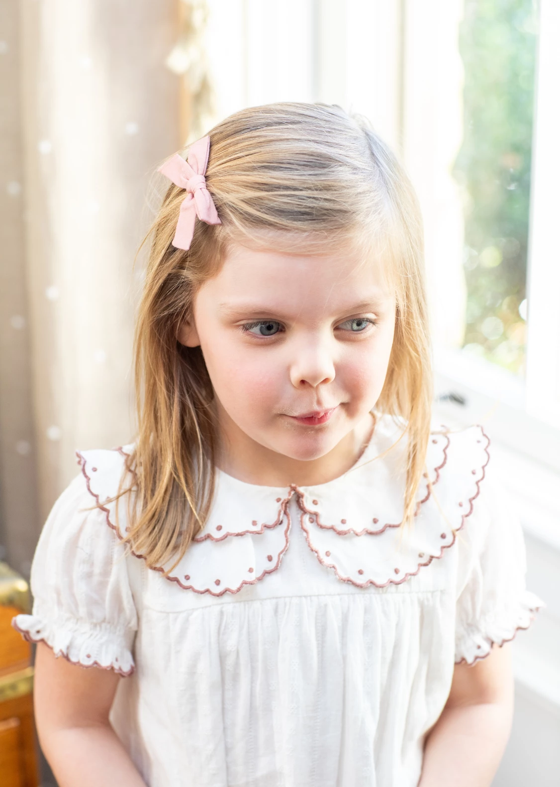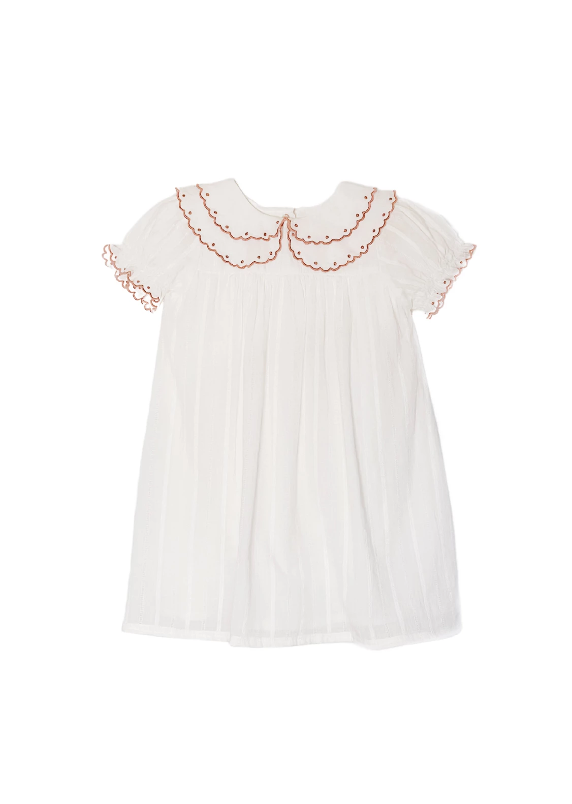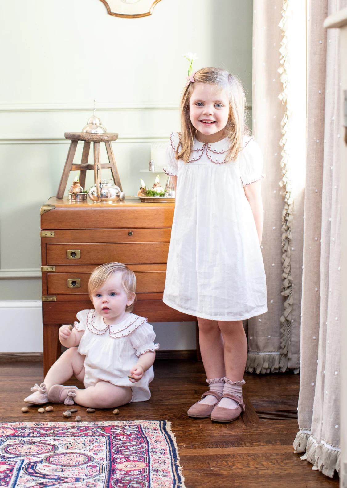 Inspired by a vintage piece from their founder Katie’s collection, the cream-colored linear cotton eyelet Evie Dress features a scalloped, double Peter Pan collar, dusty pink embroidery along the collar’s edge, and slightly-ruffled elastic sleeves. The dress is machine washable so you don’t have to worry about your little one getting it dirty.
