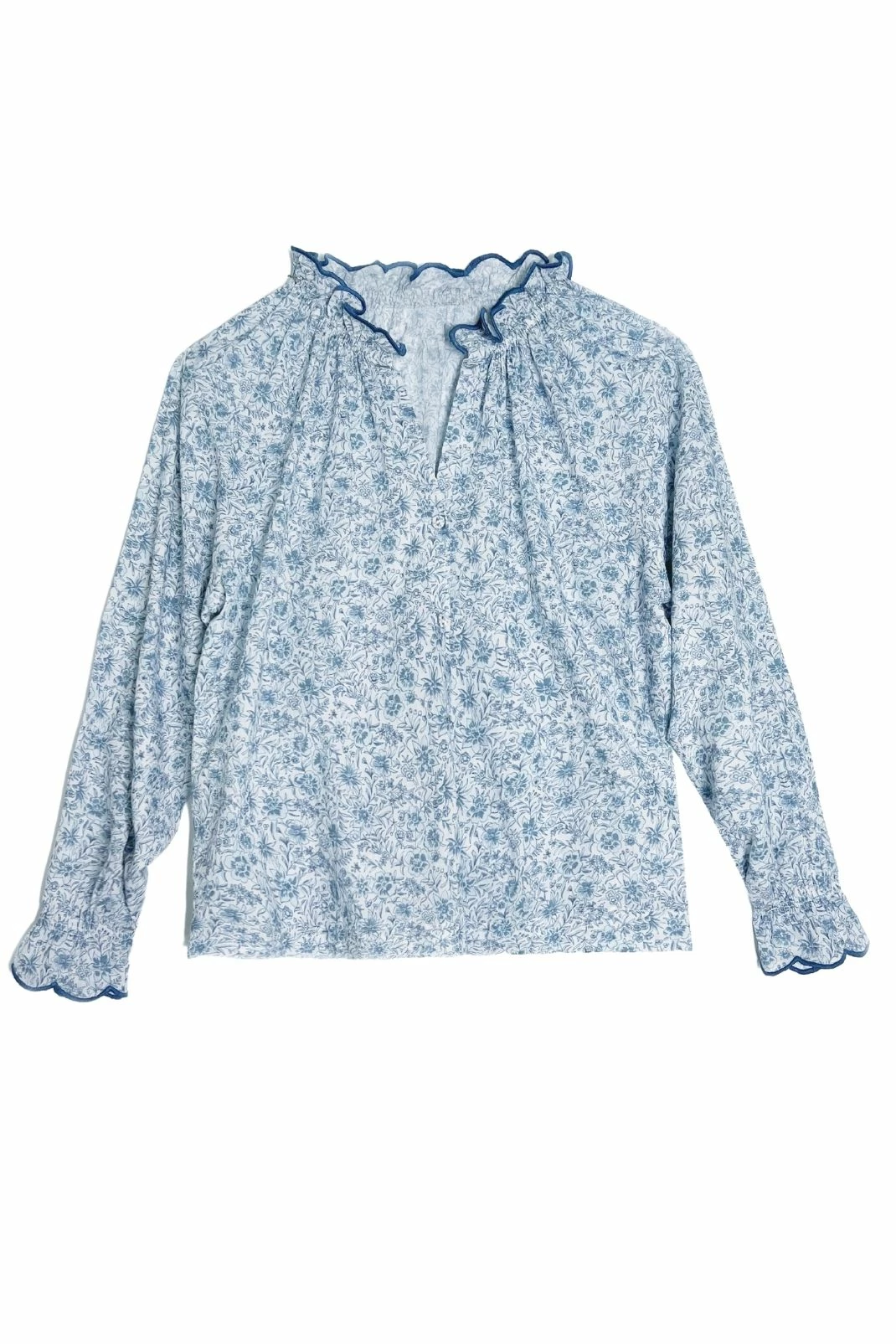 - Blue embroidered scallop at neck ruffle and sleeve hem