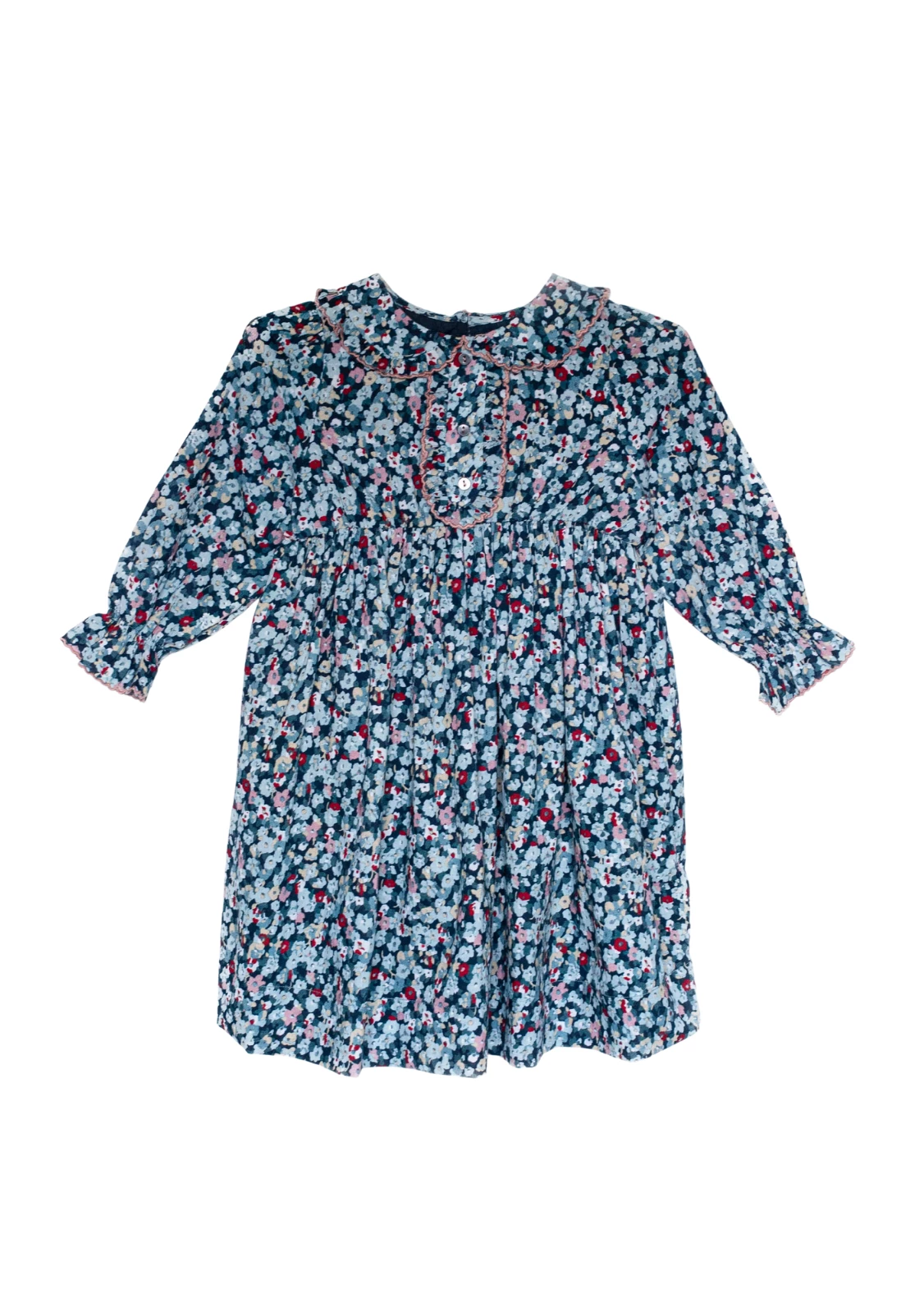 - Ruffle collar and placket detailing with fixed buttons