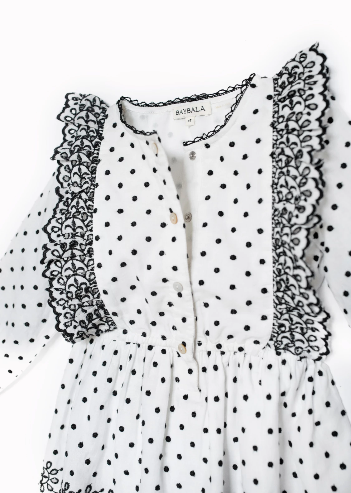 If black and white are forever, you can fully expect the girl’s Vivi Dress to stand the test of time. The most stunning black and white eyelet make up the prettiest girl’s silhouette. An elastic waist lends comfort while a button-down front offers ease. Black trim adds a delicate finishing touch at the neck and wrist. 100% cotton voile makes this an easy-to-wear style despite its stunning attention to detail. Pair with the women’s Harlow Dress for mama + mini styling.