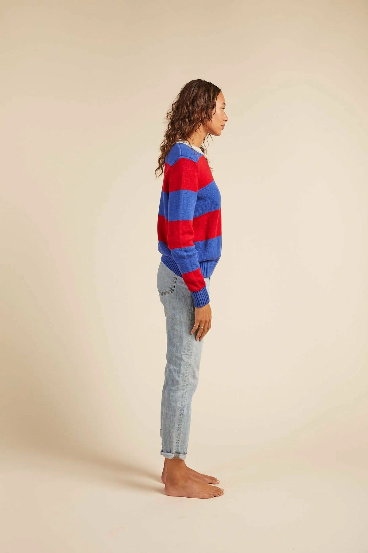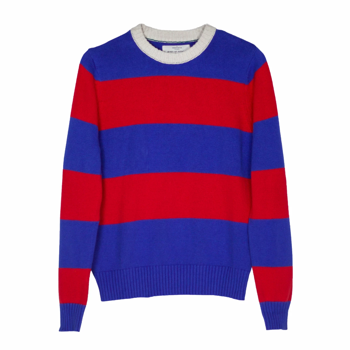 The Barbara sweater is the perfect weight for those early fall evenings. Made from medium weight soft knitted cotton. We love the bright Blue and Red color-block with contrasting cream neckline.