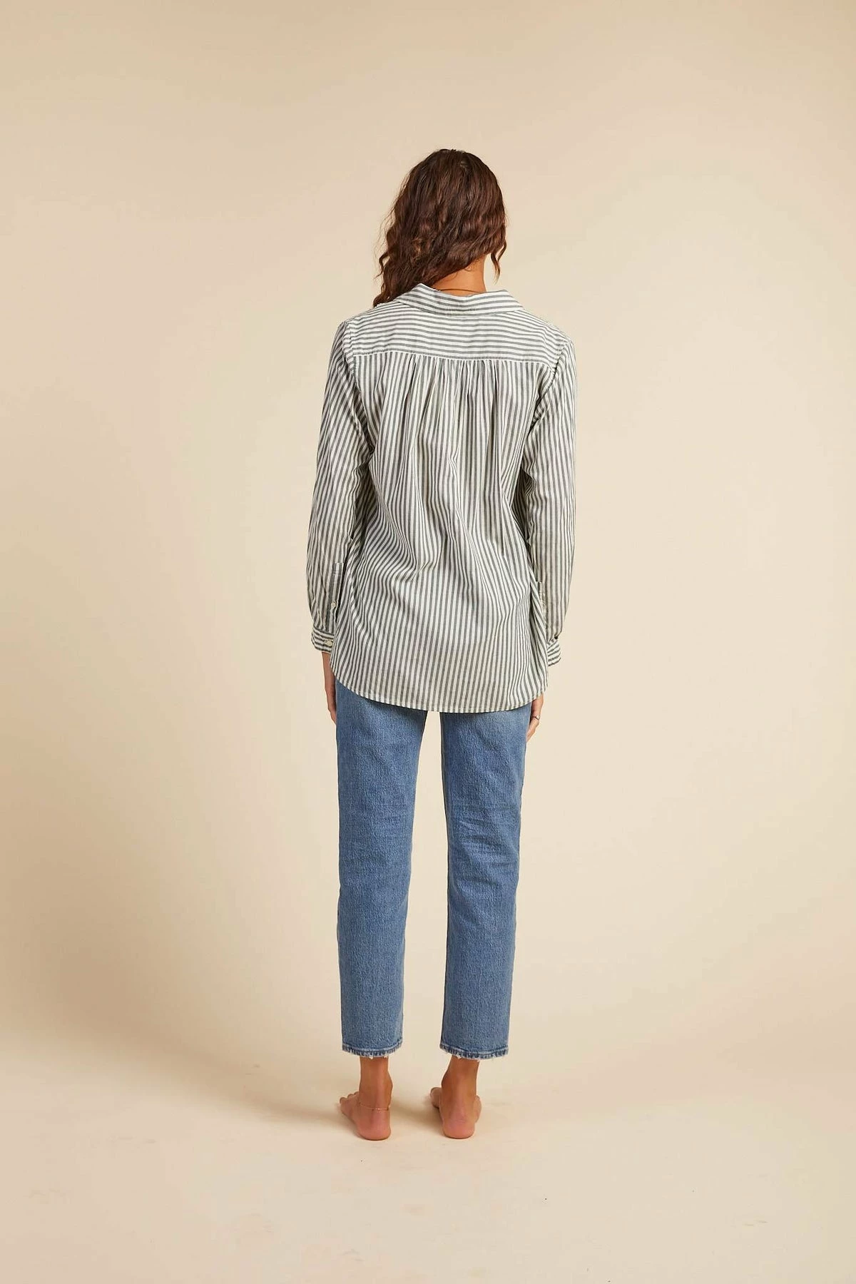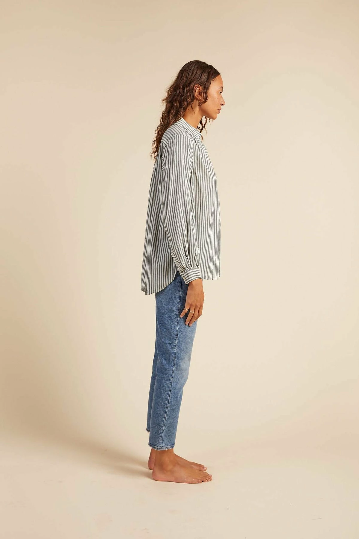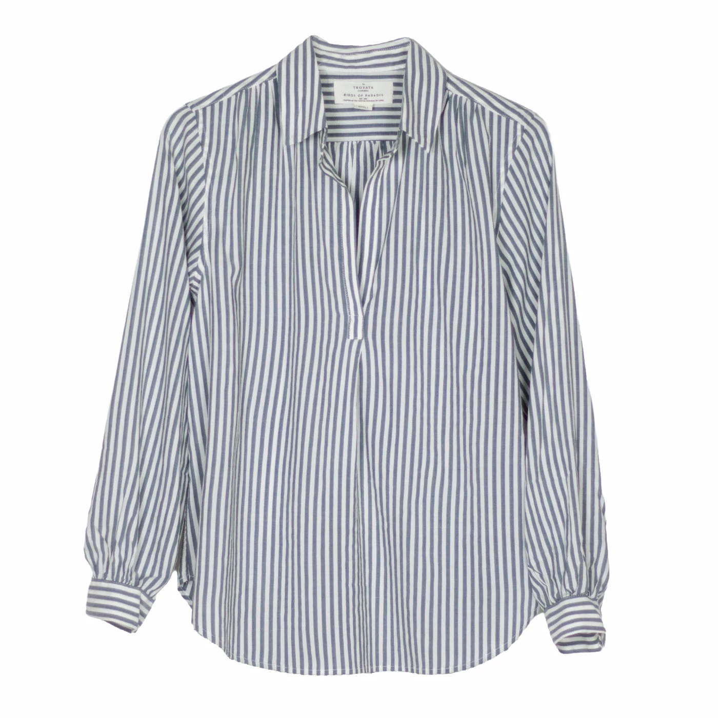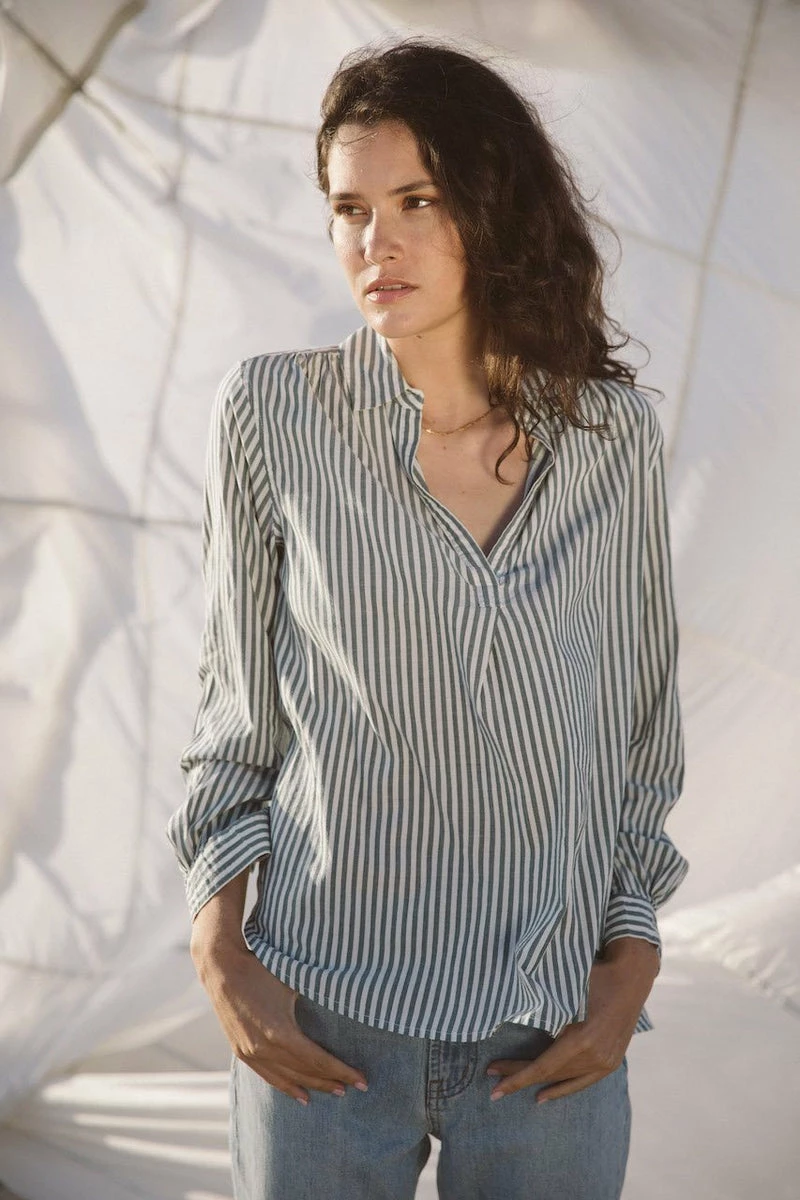 This hi-low relaxed Henley body has a shirt collar with an open v-front neckline. Finished with slight gathers at the shoulders and shirttail hem.