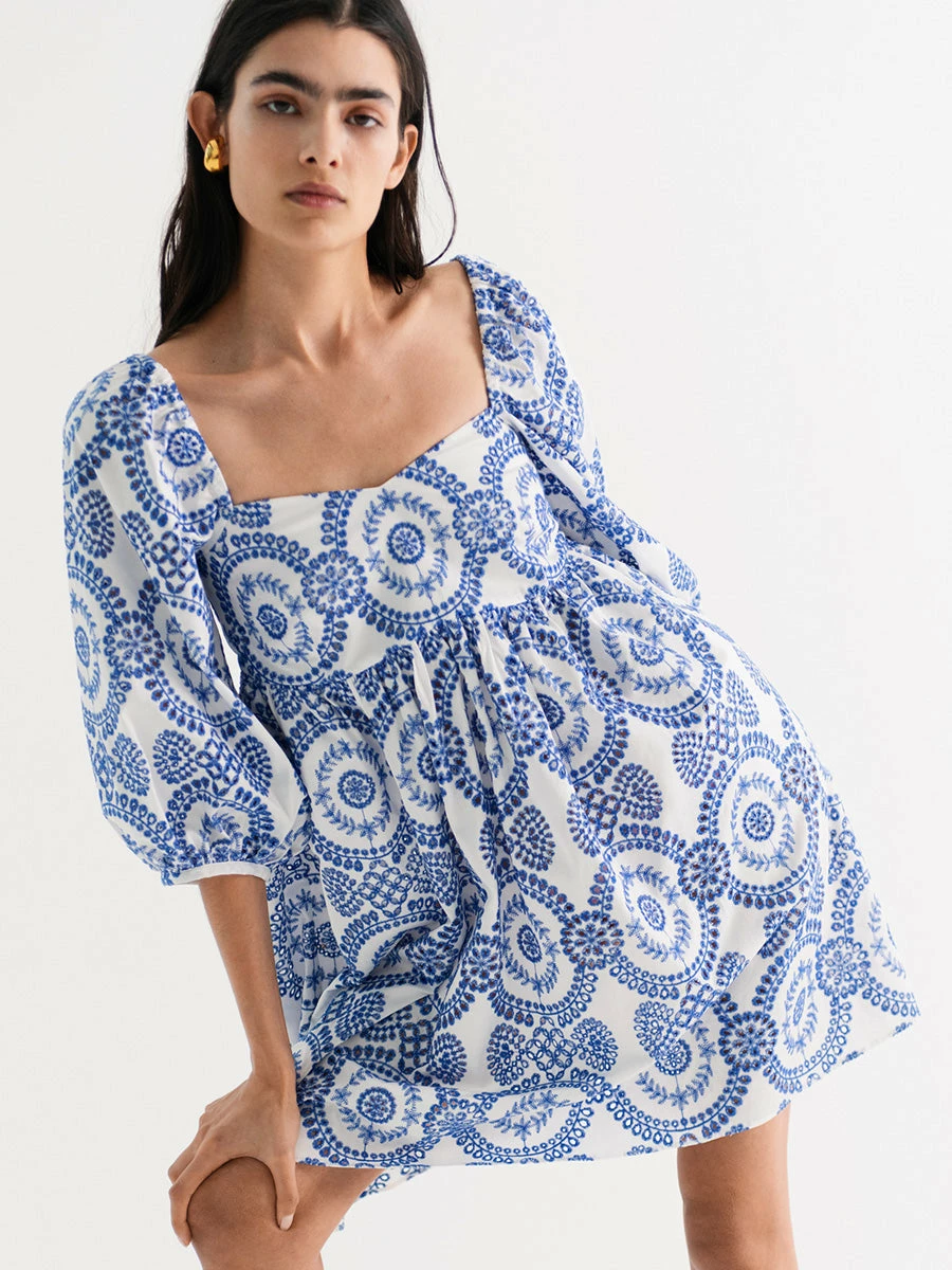- Square neckline and elbow-length puff sleeves