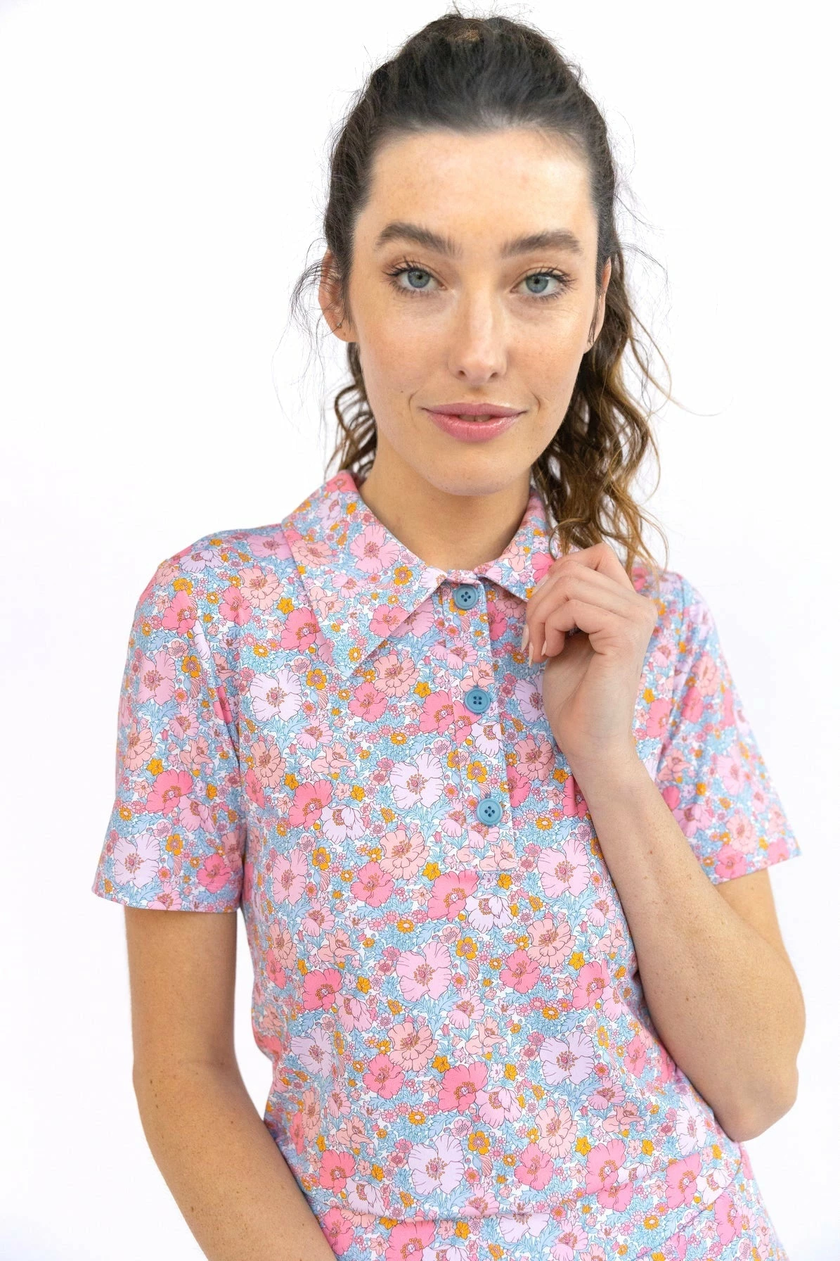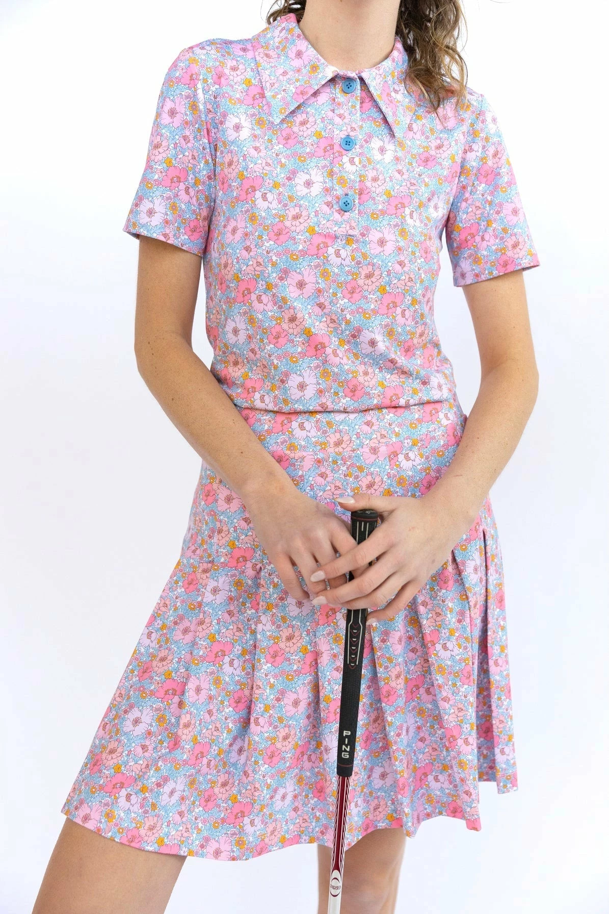 The Charlotte Polo from Byrdie Golf is a wardrobe staple. Finished with light blue buttons and a slimming fit that makes for a flattering and functional silhouette. Pair this back to their Sharon Pleated Skort for a chic course to cocktail ensemble!