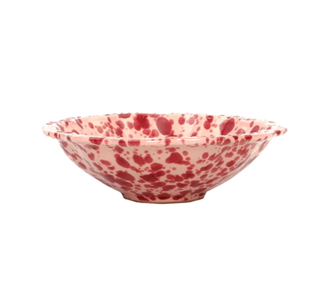 The speckled small bowl is hand-painted in Puglia with a scalloped edge and decorative, undulating rim.