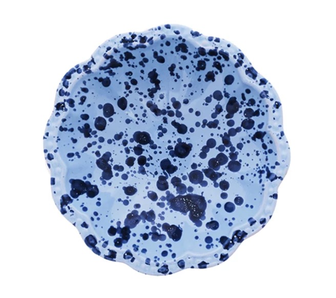 The speckled small bowl is hand-painted in Puglia with a scalloped edge and decorative, undulating rim.