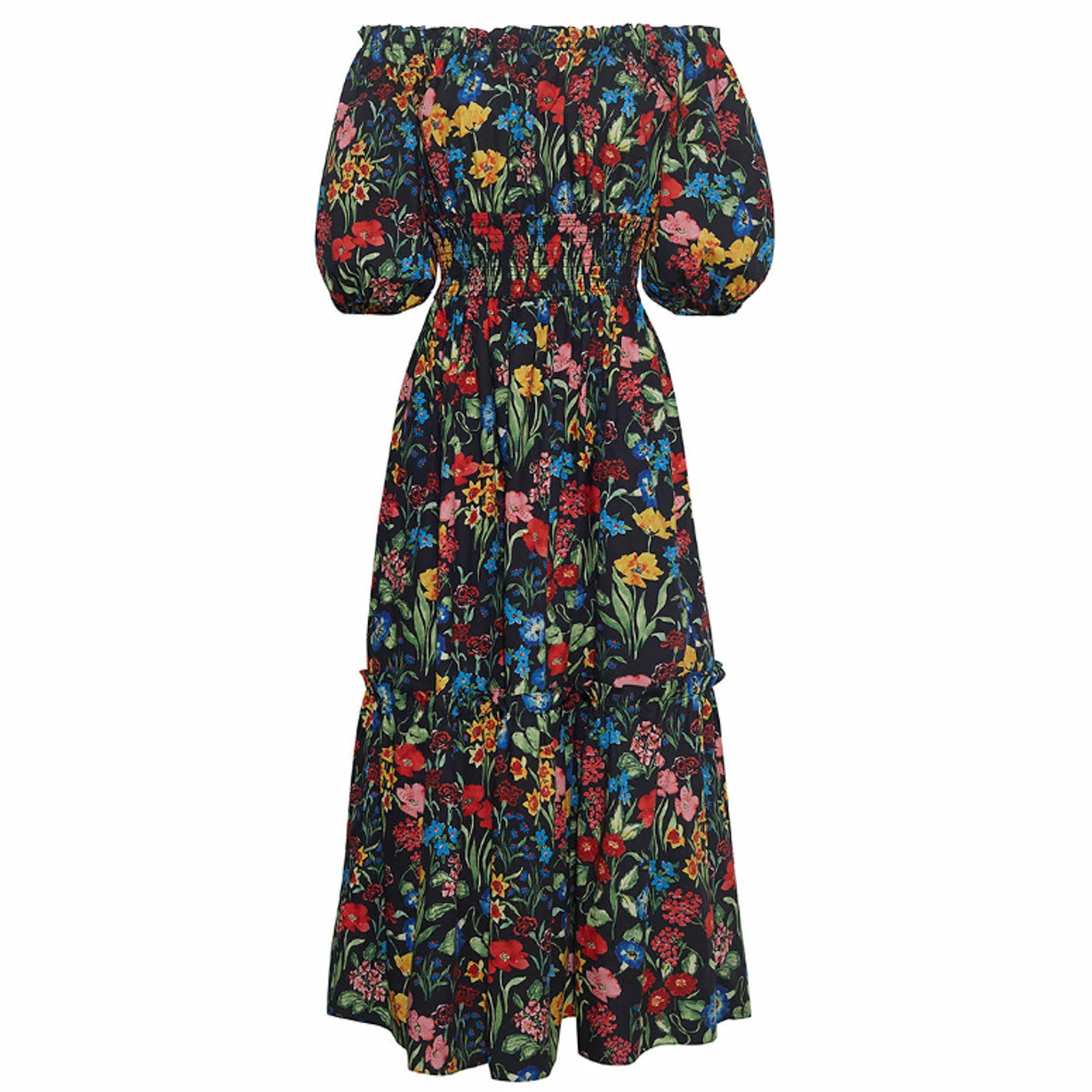 The Mimi Dress is cut from breathable cotton poplin into an A-line cut that’s smocked so flatteringly along the waistline. The puffy sleeves can be styled on or off the shoulder.