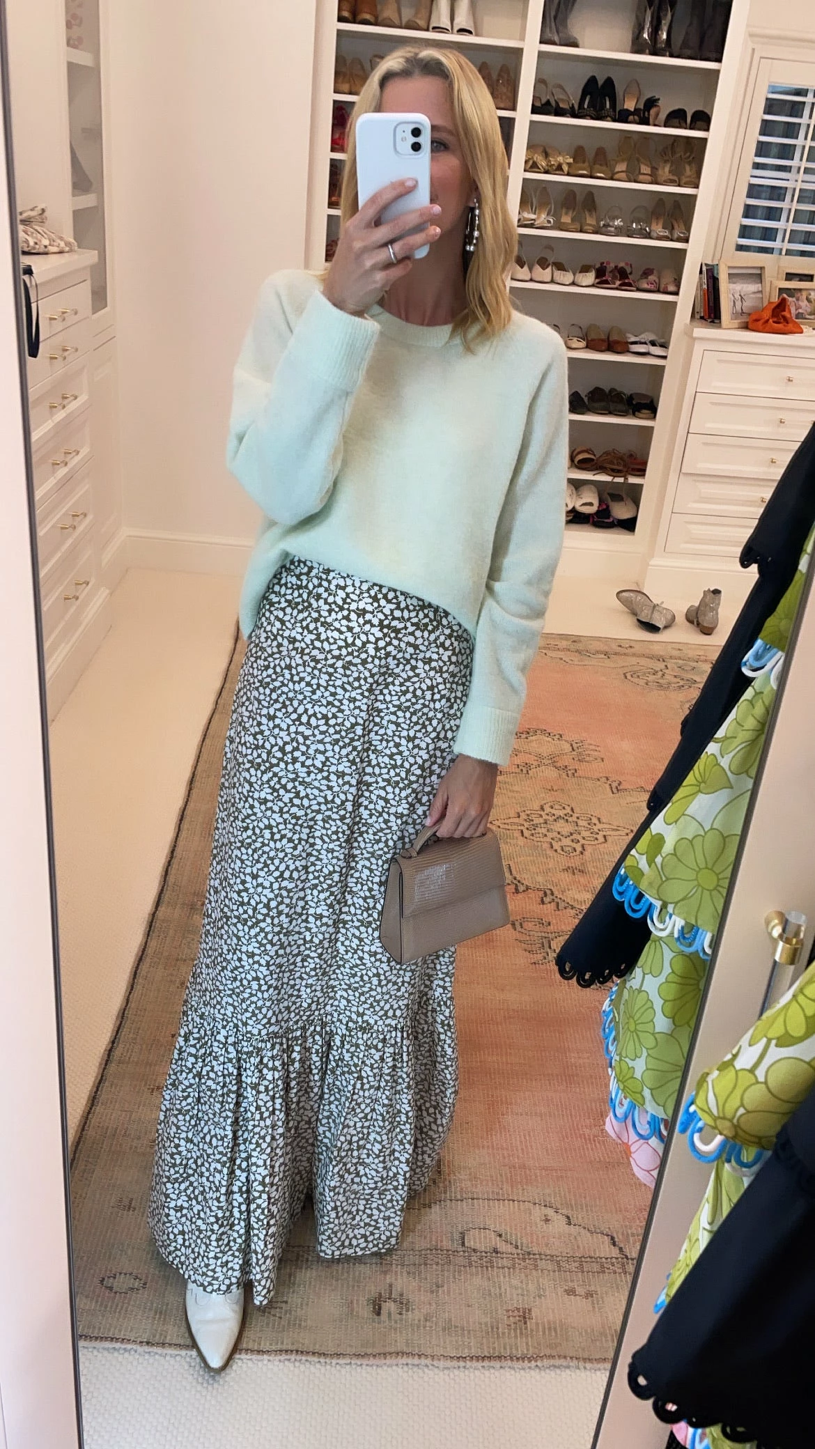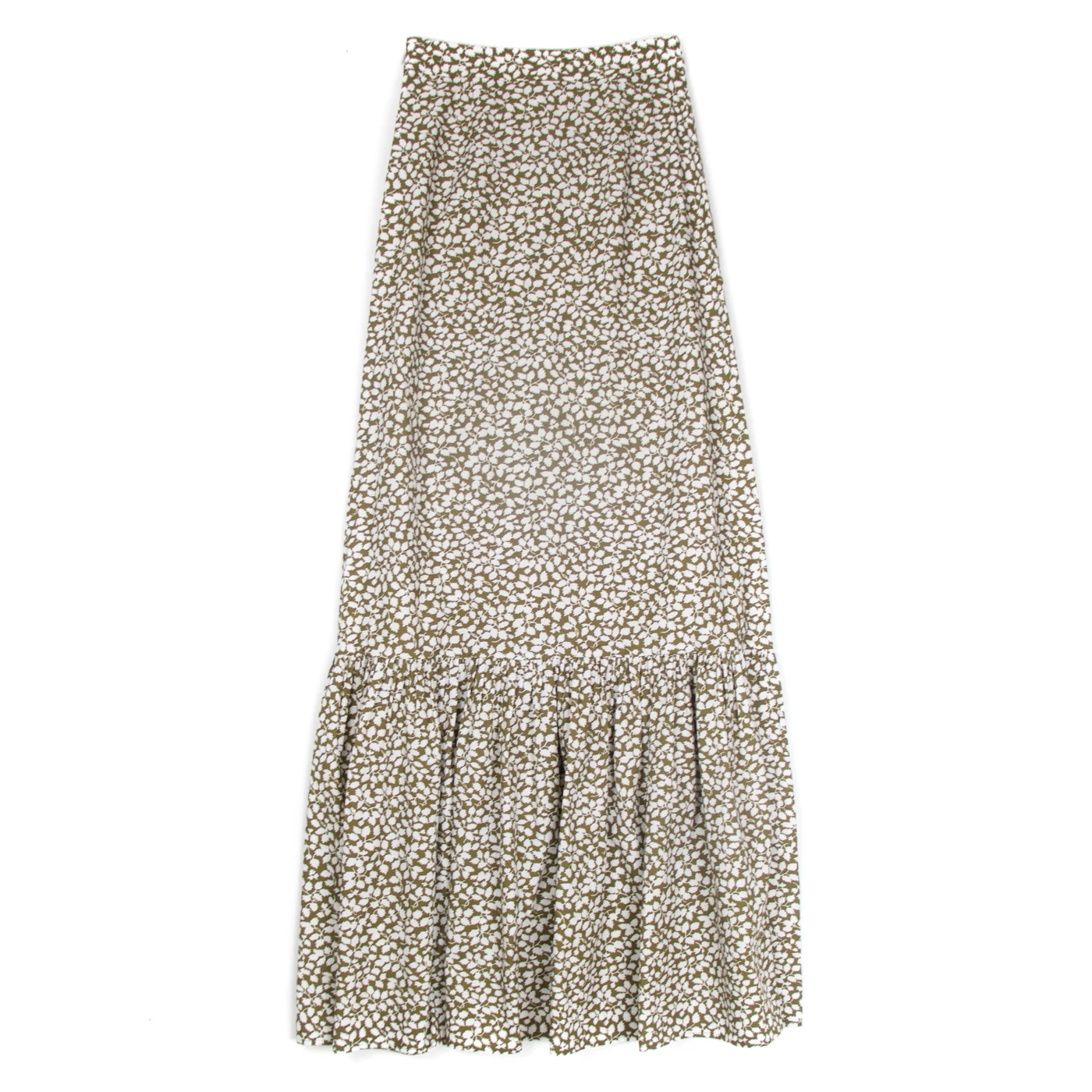 Made from soft, structured cotton, this high-waisted skirt is fit slim to skim your lower half until its wide ruffle grazes the floor. It zips up the back with an invisible zipper. We pair it with this billowy blouse and these studs.
