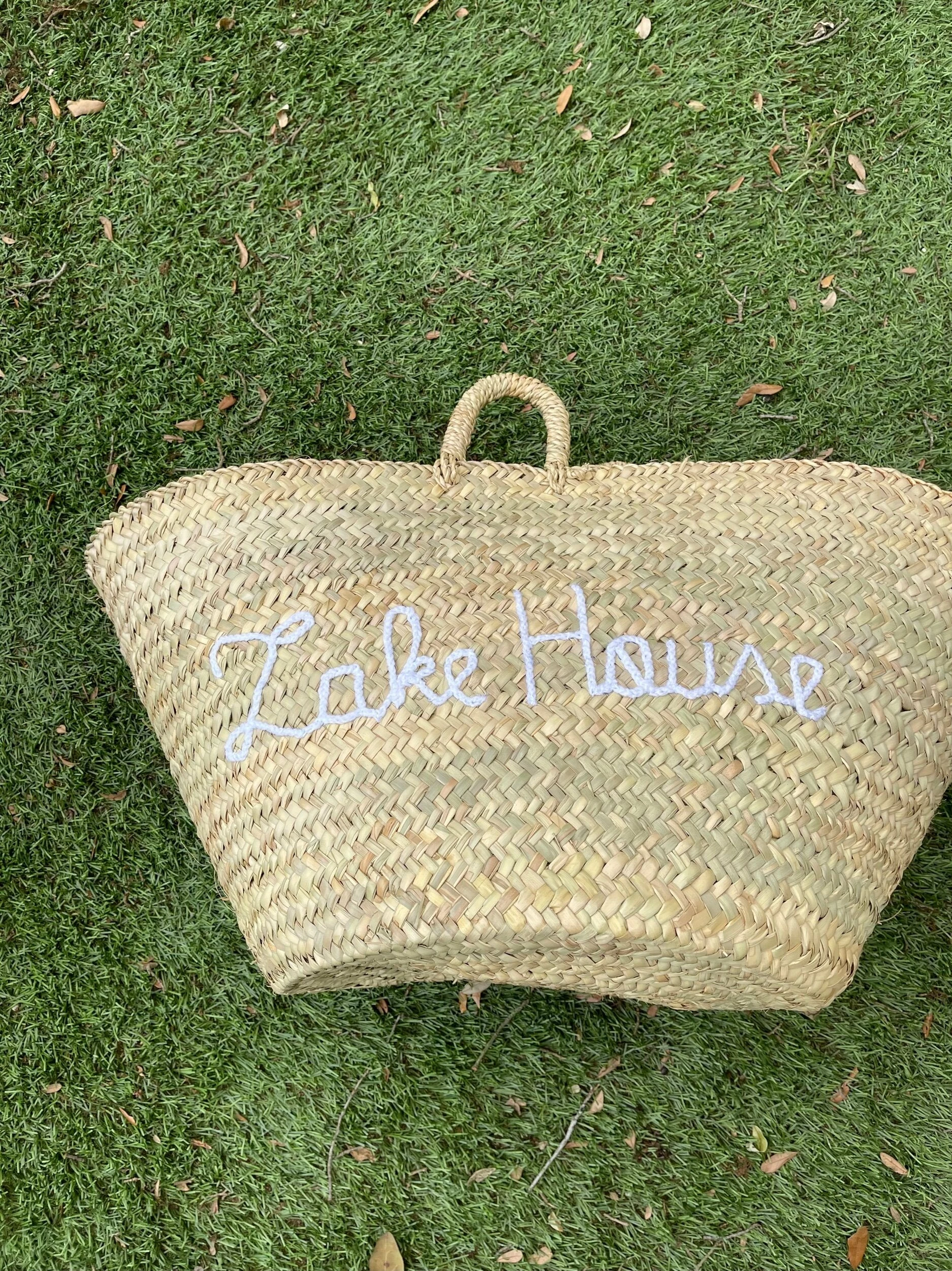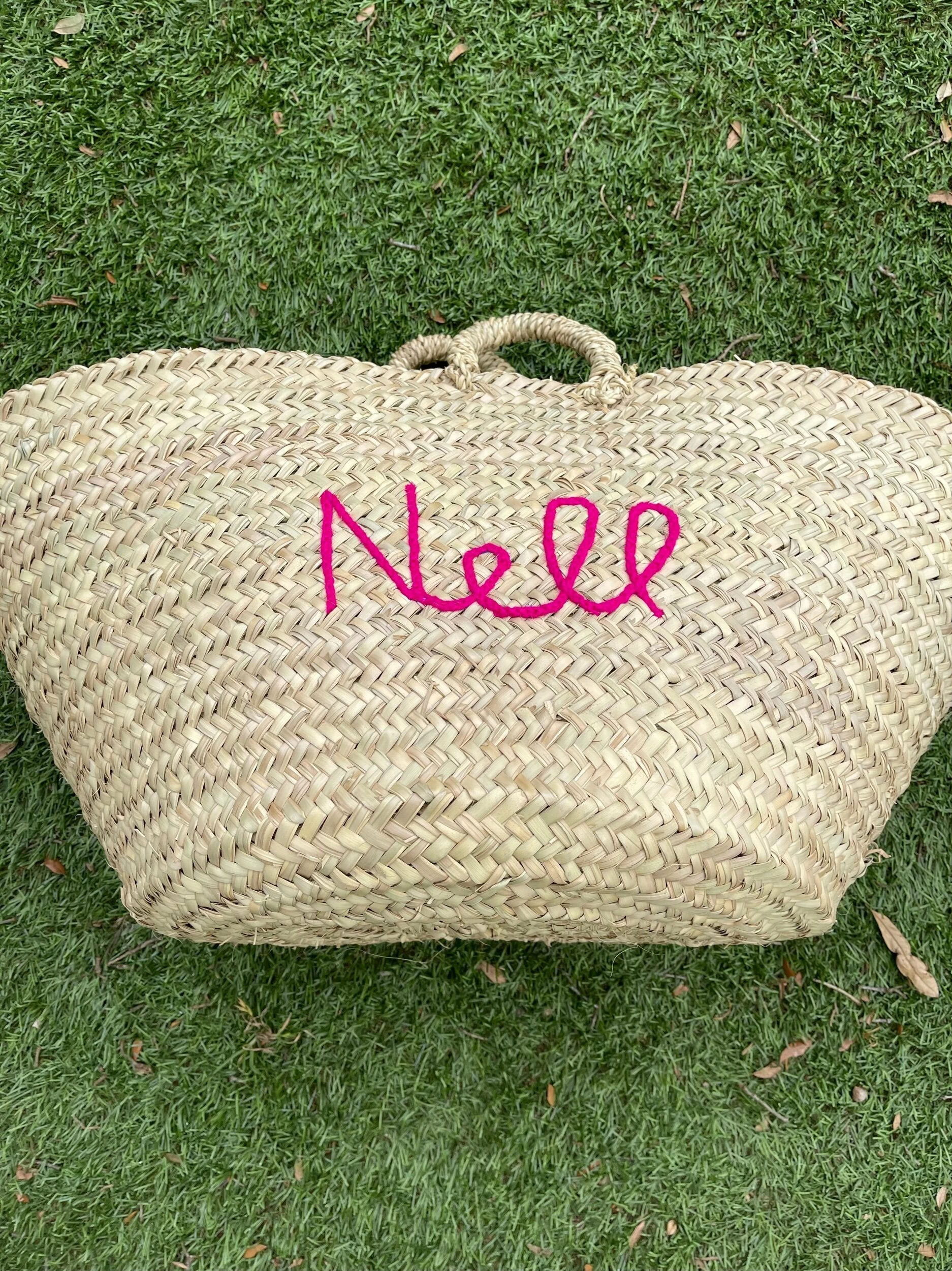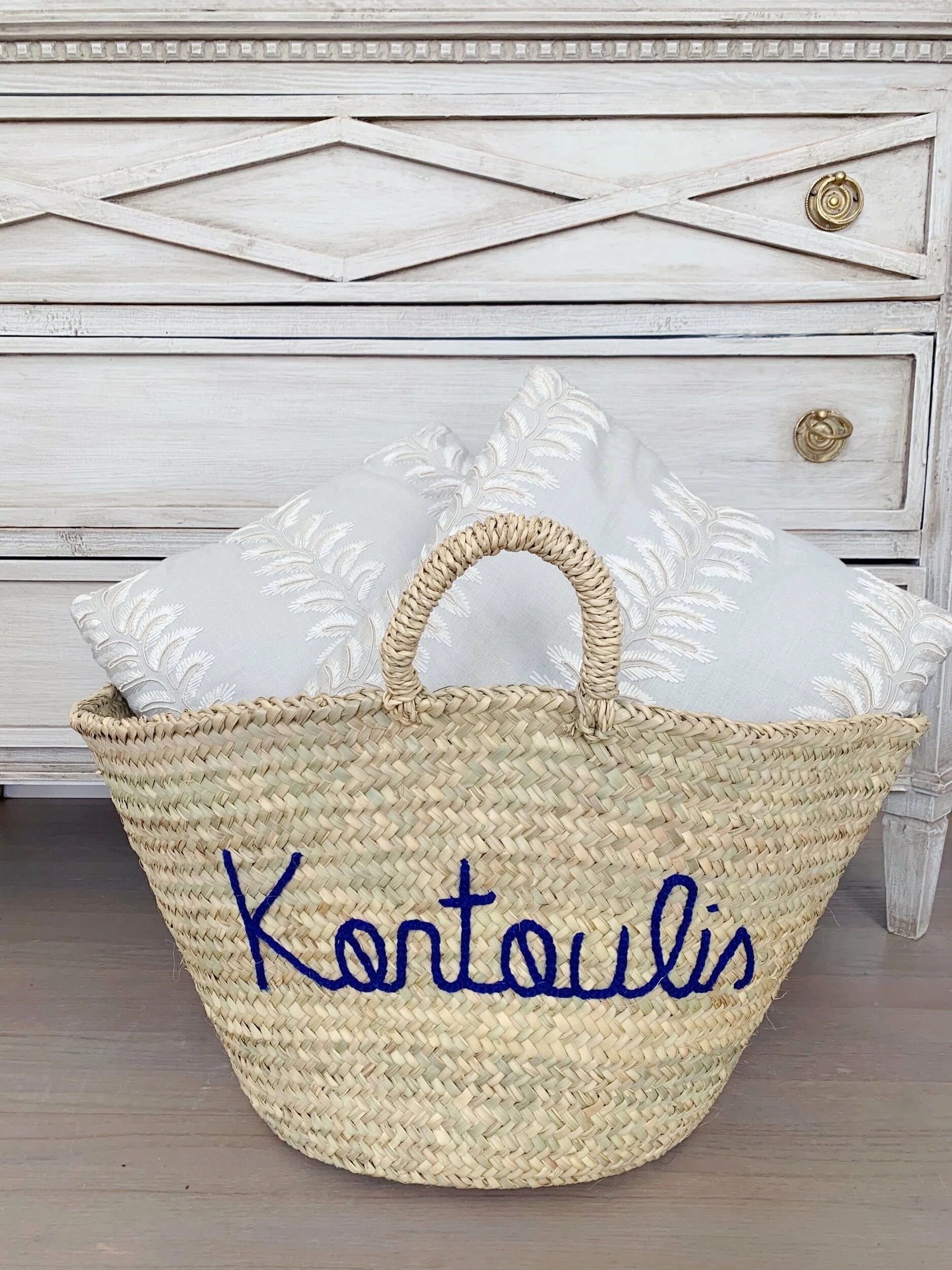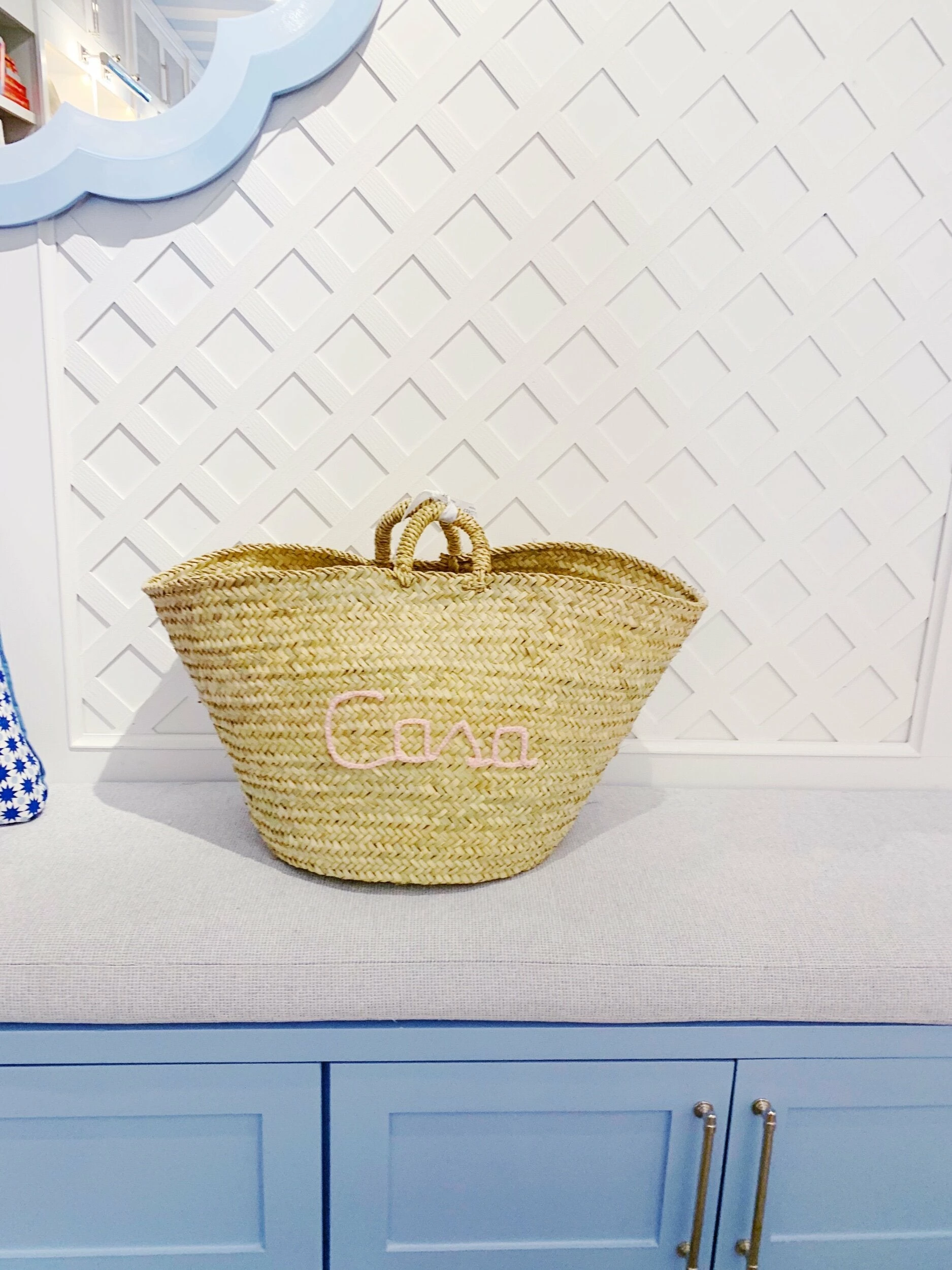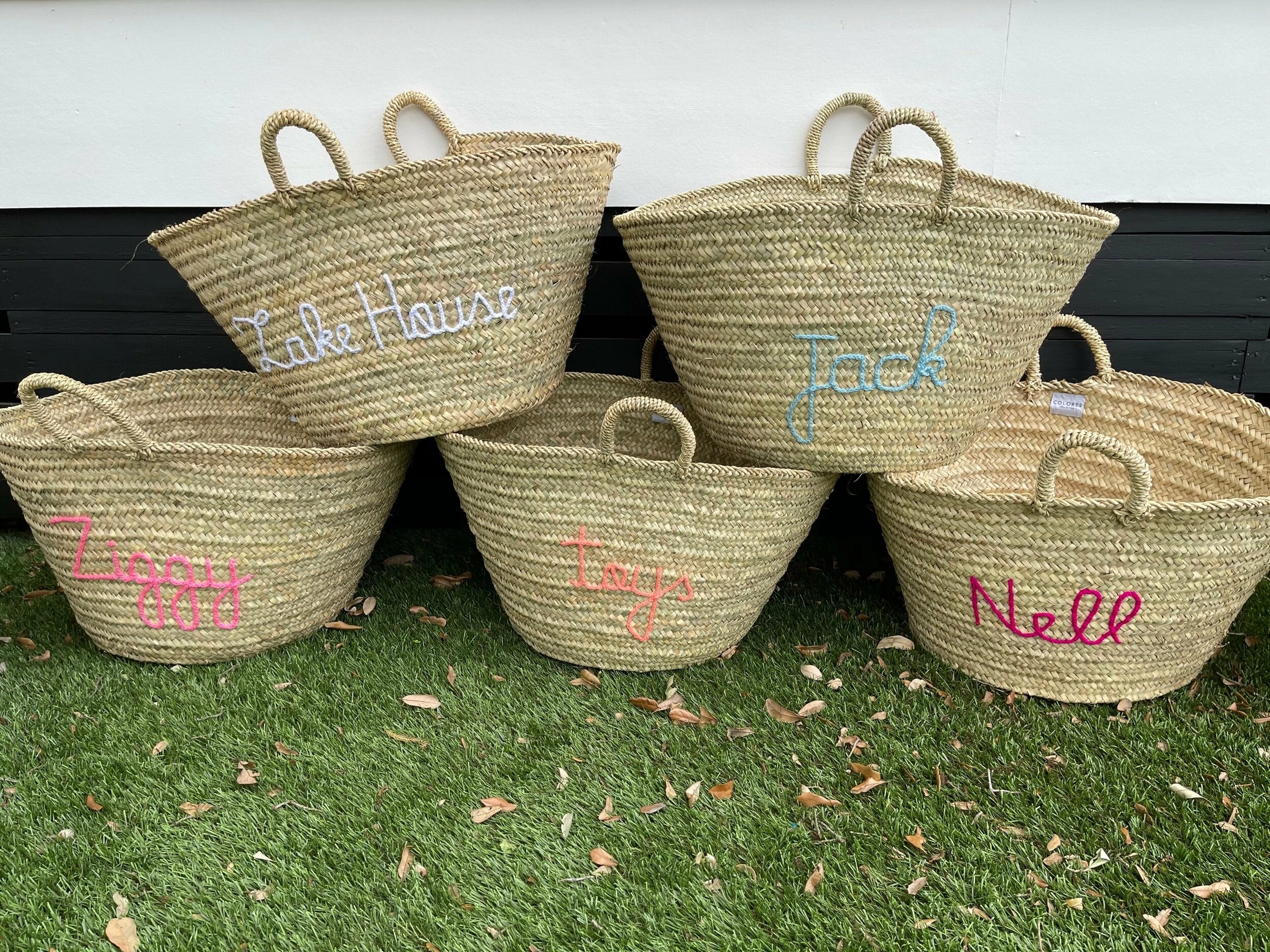 Handwoven and hand-embroidered with the text of your choice by the COLORES Collective team in Morocco, each bag is unique. These versatile baskets are a favorite in the living room, bathroom, poolside, or on the go. They are large enough to fit several towels, blankets, pillows toys, clothing, and more.