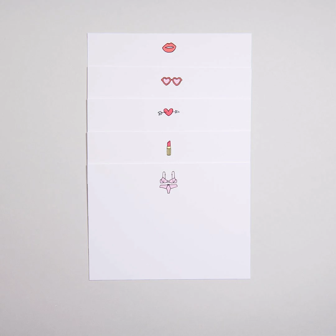 - Two of each hand-drawn design in every set: Lips, Cupid’s Heart, Lipstick, Lolita sunglasses, Lingerie