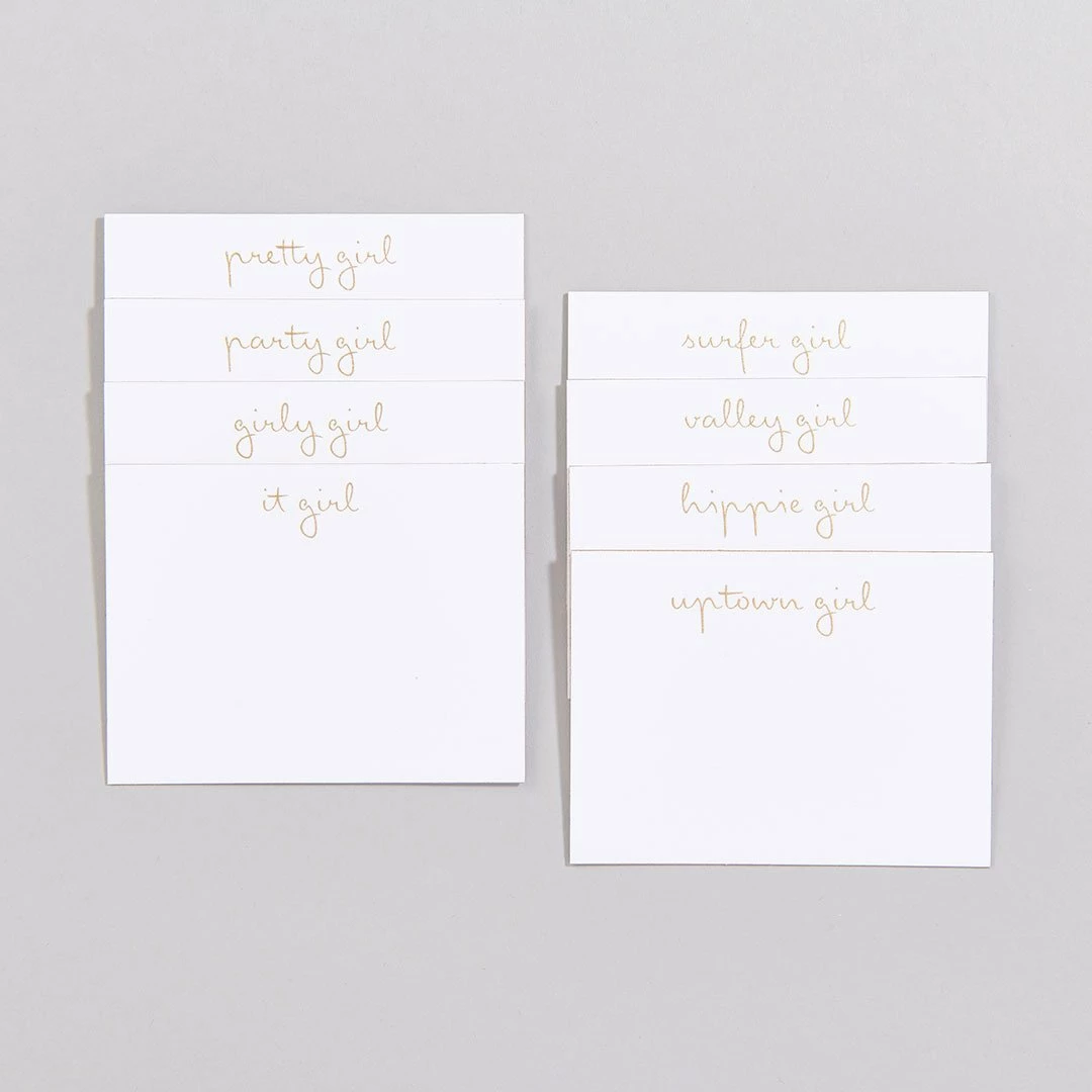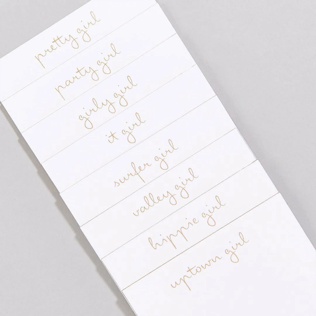- Three of each saying in every set: It Girl, Surfer Girl, Party Girl, Uptown Girl, Valley Girl, Hippie Girl, Pretty Girl, Girly Girl