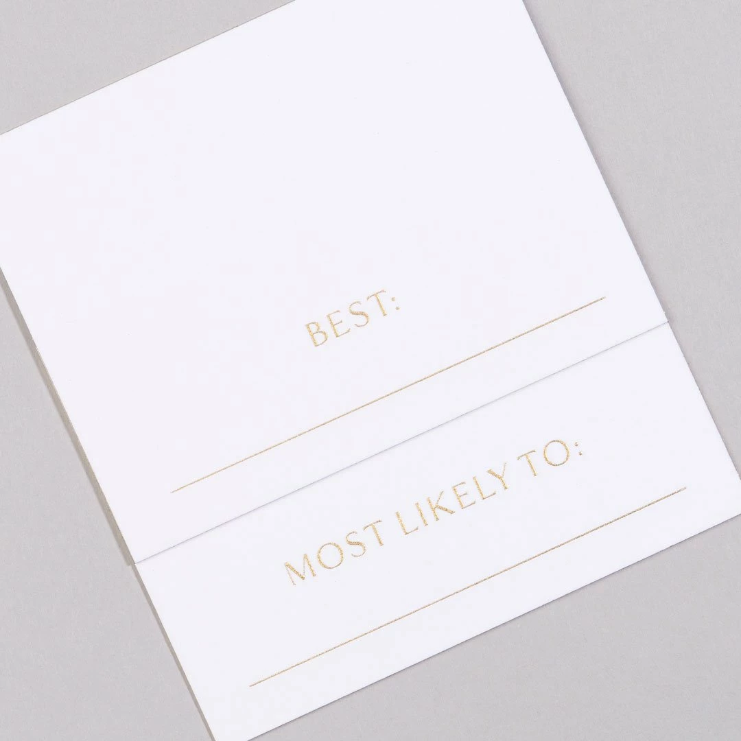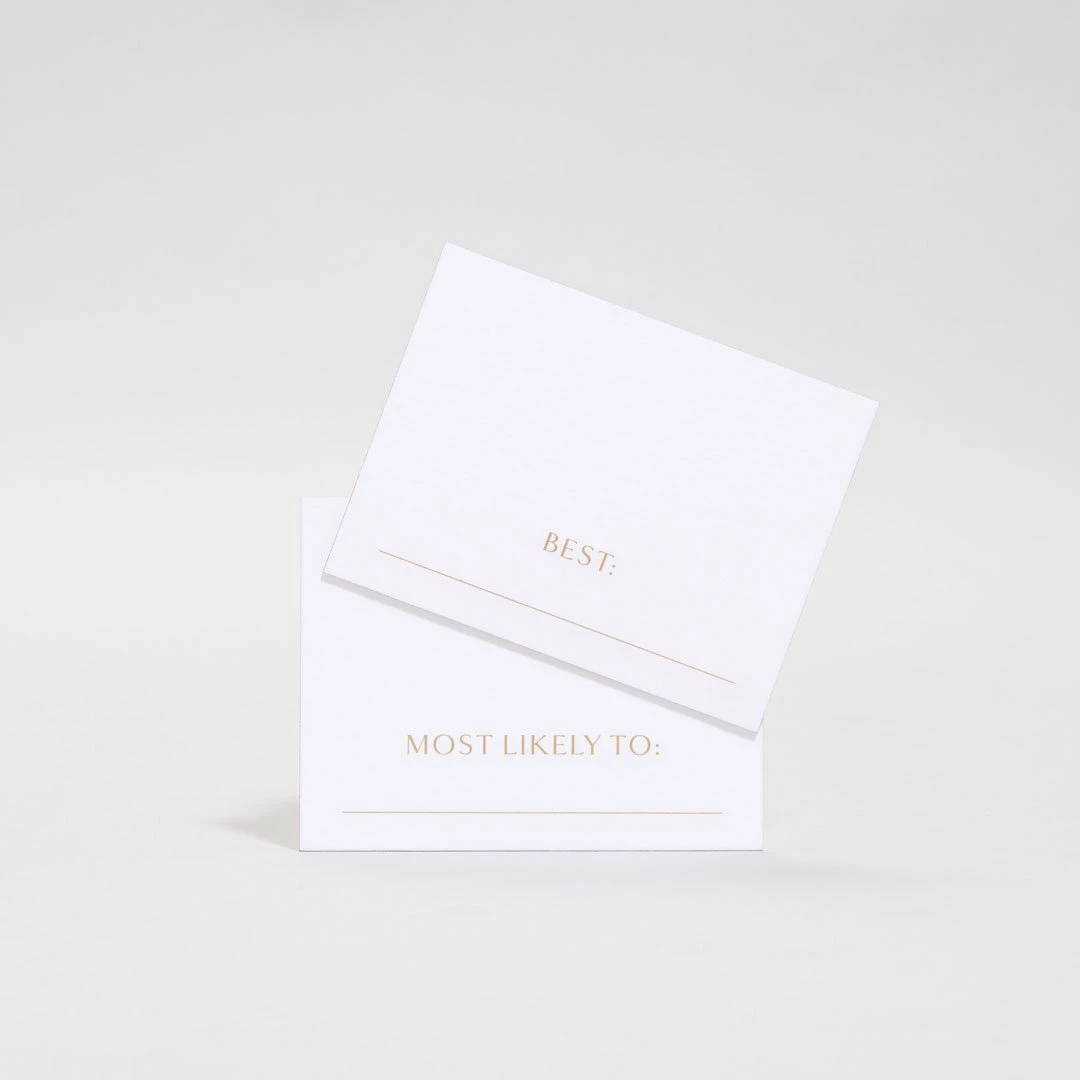What better way to start a beautiful evening (and some lively conversation) than with a little awards ceremony? Our Superlatives Place Cards let you honor each of your guests with a “best” or “most likely to” accolade. Engraved in gold ink for extra luxe.