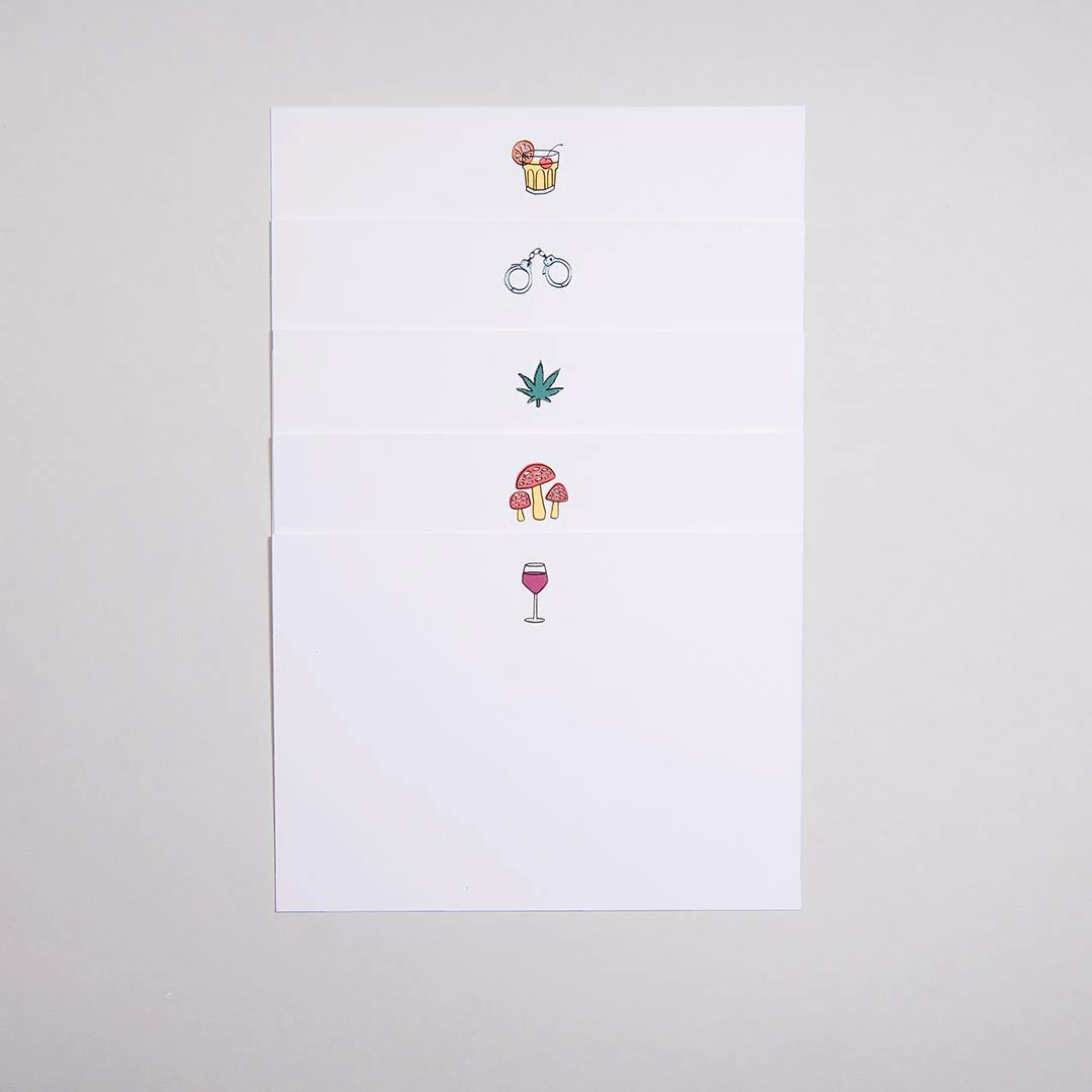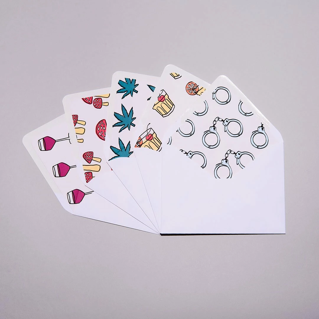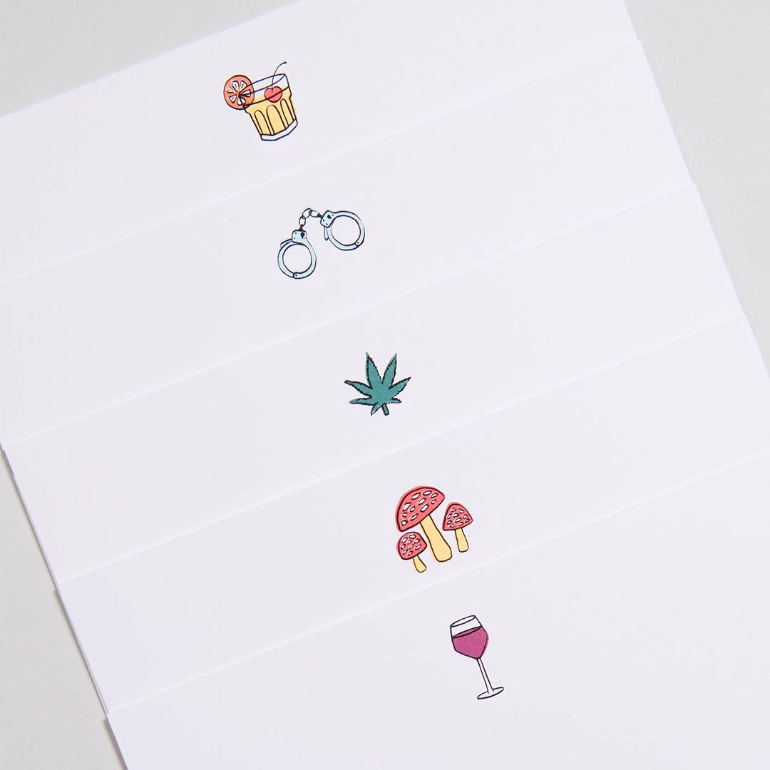 - Two of each hand-drawn design in every set: Cocktail, Wine, Weed, Handcuffs, Shrooms.