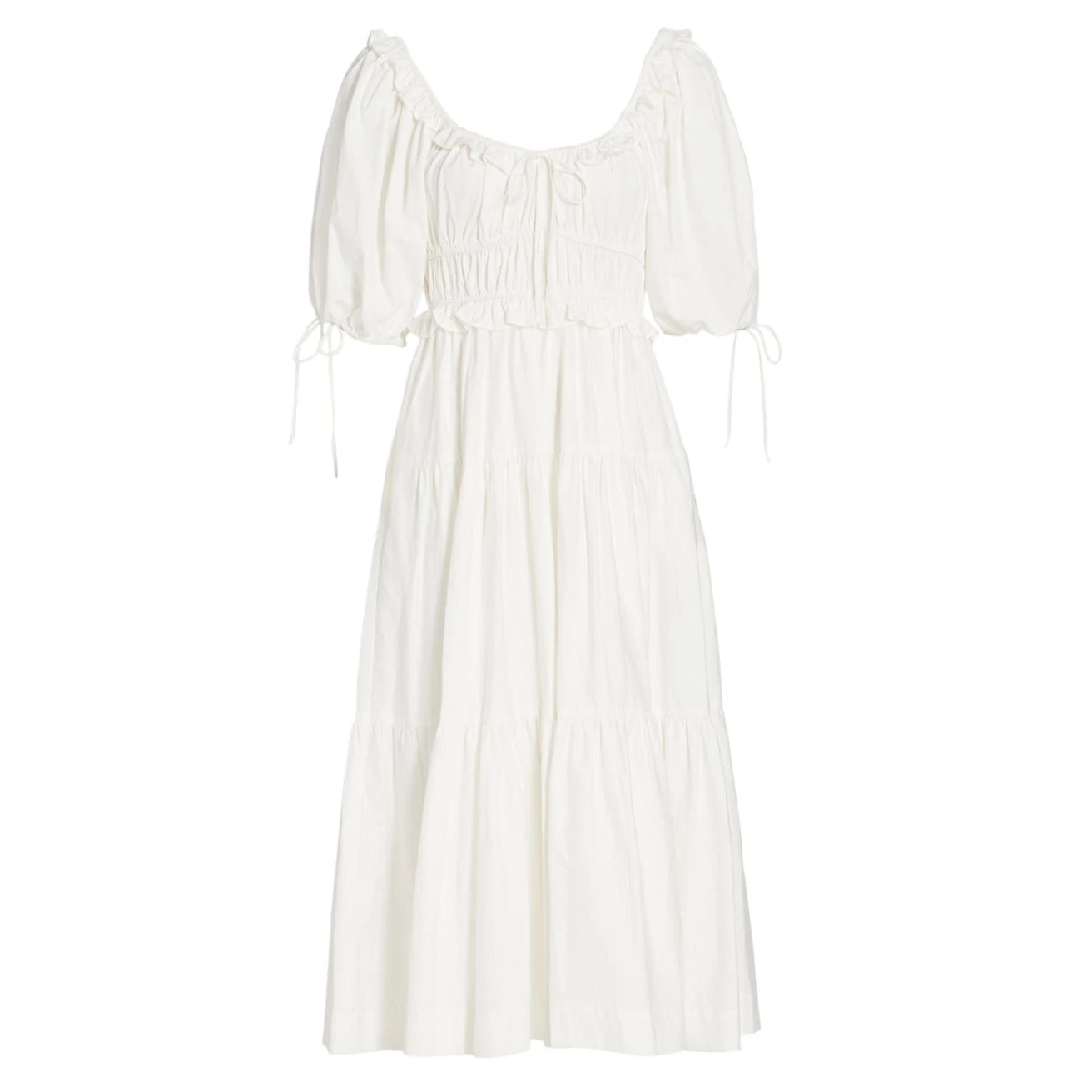 This midi dress is composed of a cotton poplin fabric, featuring a tiered skirt and ruffle detailing.
