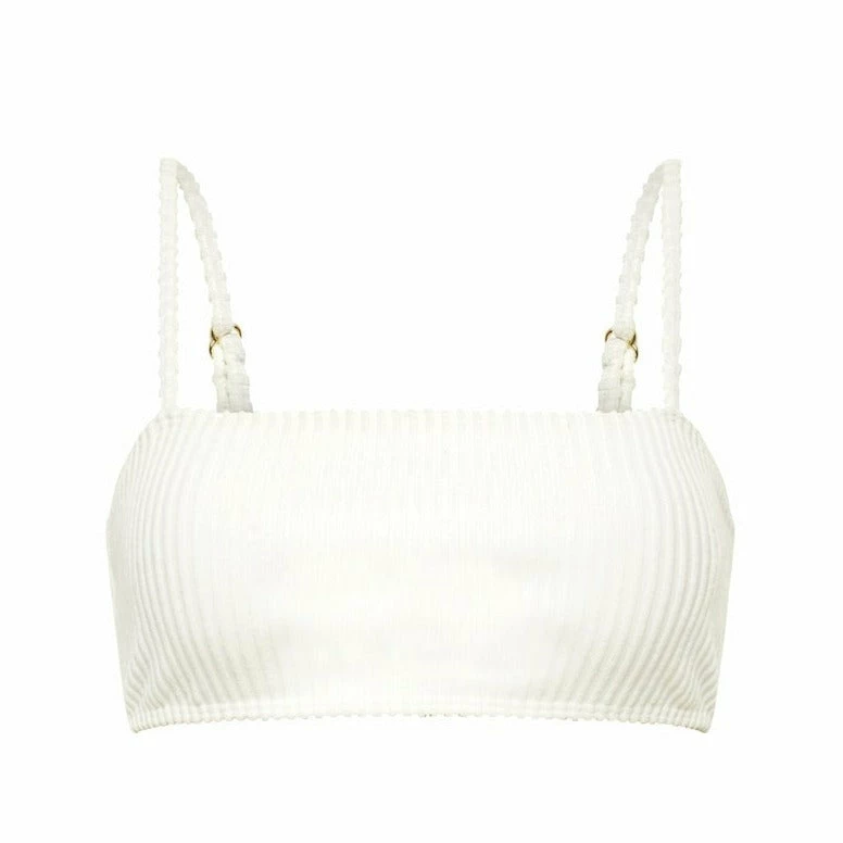 The Adara Bikini Top offers a square neck bandeau with gold clasp detailing at the back and adjustable straps. Sustainably lined and cut from our regenerated nylon.