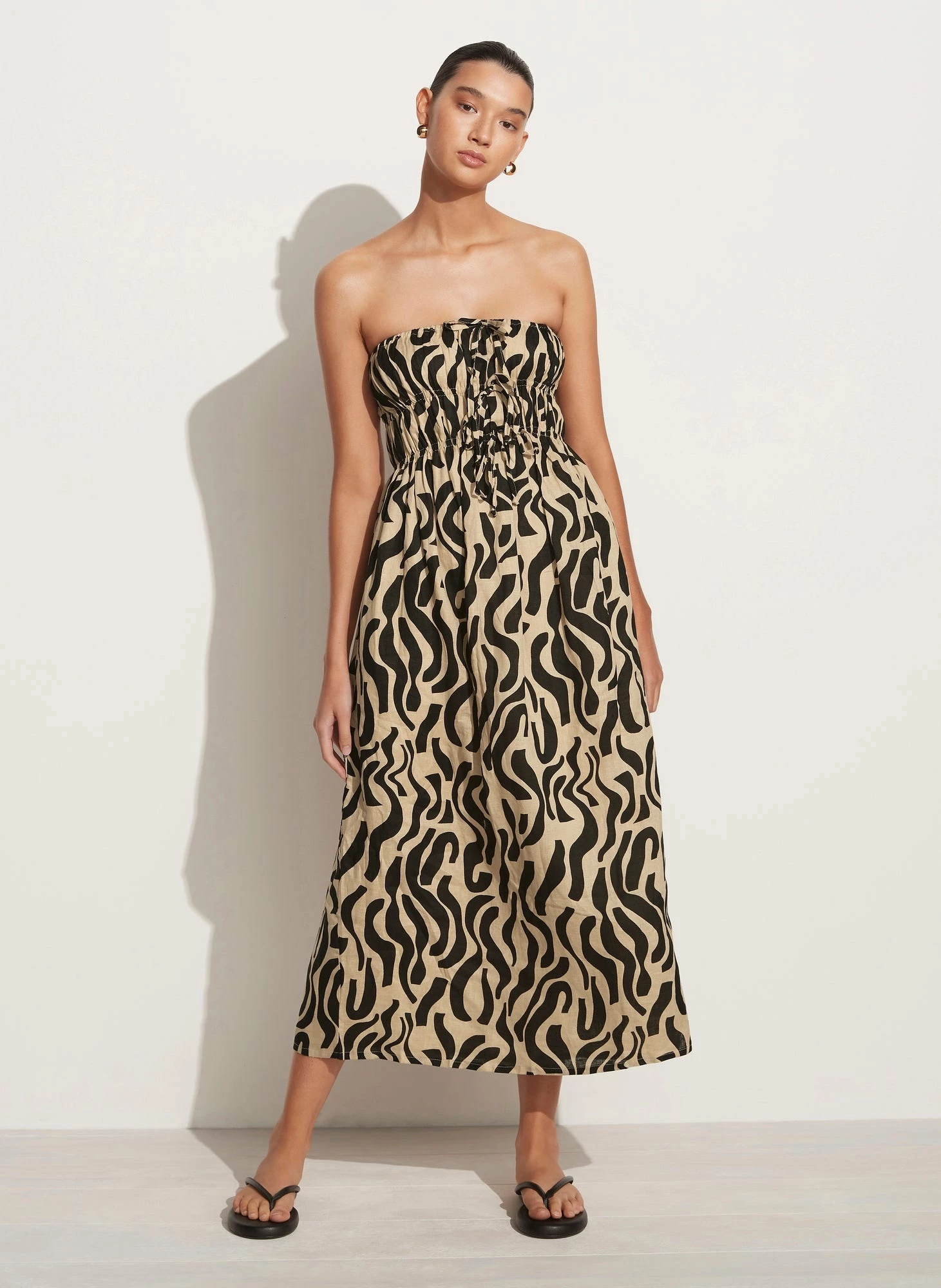 Easy wearing by design, this strapless style has been cut from a lightweight, crisp EUROPEAN FLAX YARN and features an elasticated bodice and waistband. Detailed with tie on bust and offering a gathered midi length skirt, the Contessa Midi Dress is every bit as fun as it is functional.