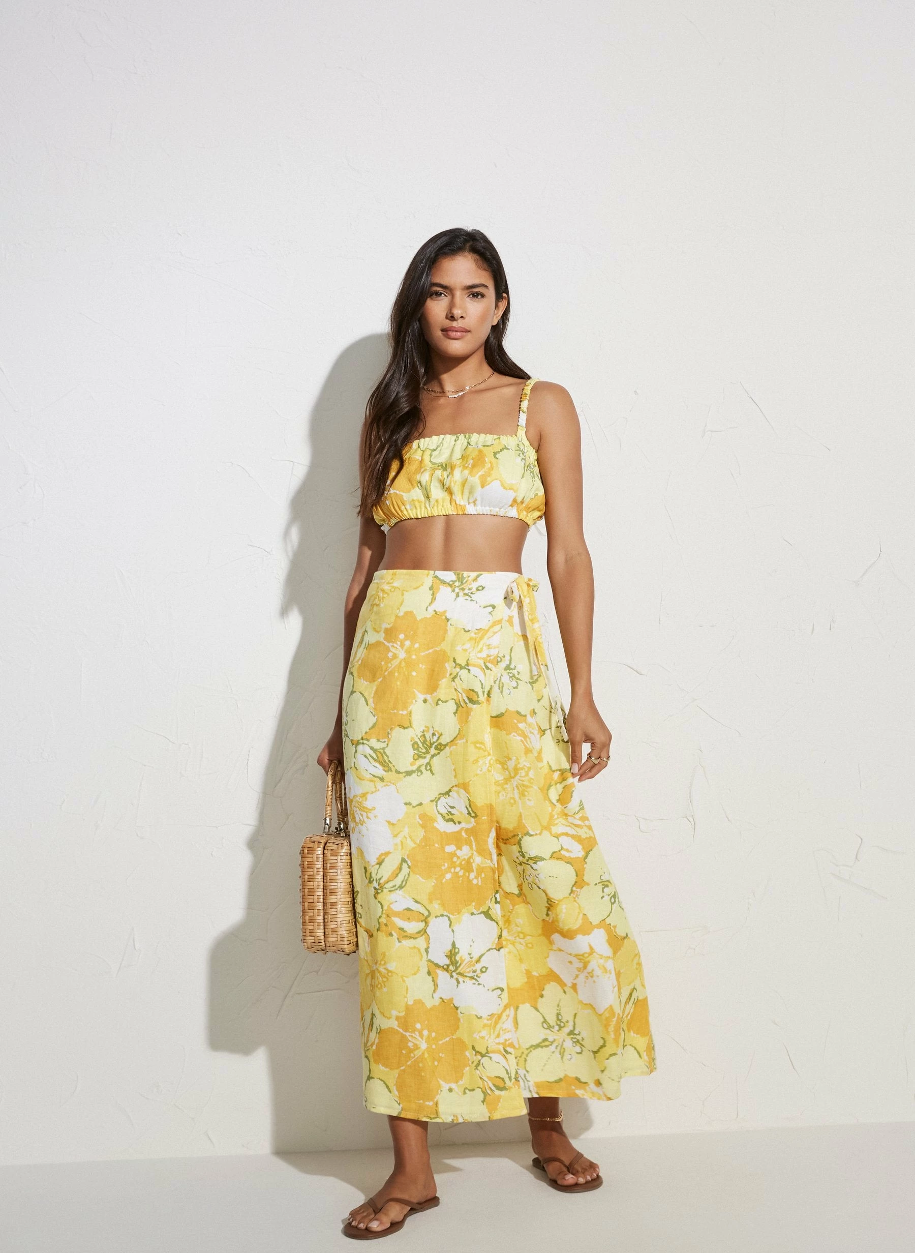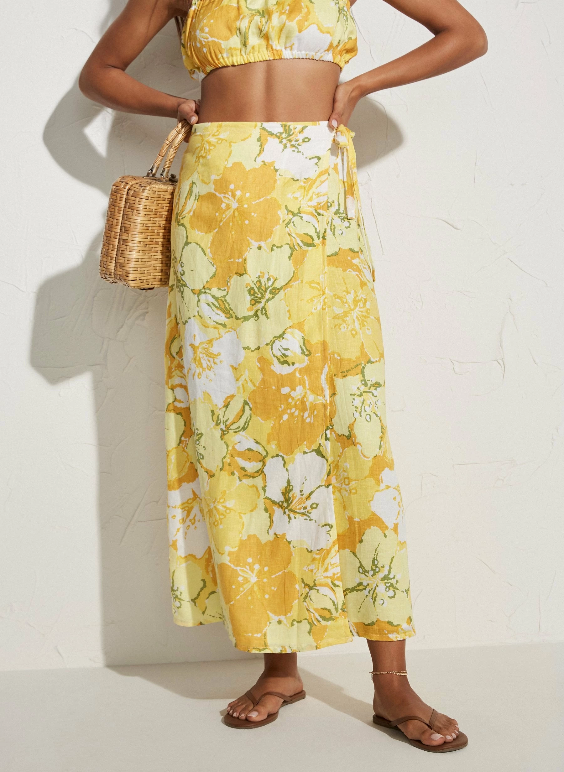 The Elodia Wrap Skirt is our go-to summer essential. Boasting versatility and hand printed in Lorretta floral, this fully lined style features a functional waist tie detail and flattering A-line silhouette. The Elodia Wrap Skirt has been cut from environmentally responsible Flax Yarn and will fall just above the ankles when worn.
