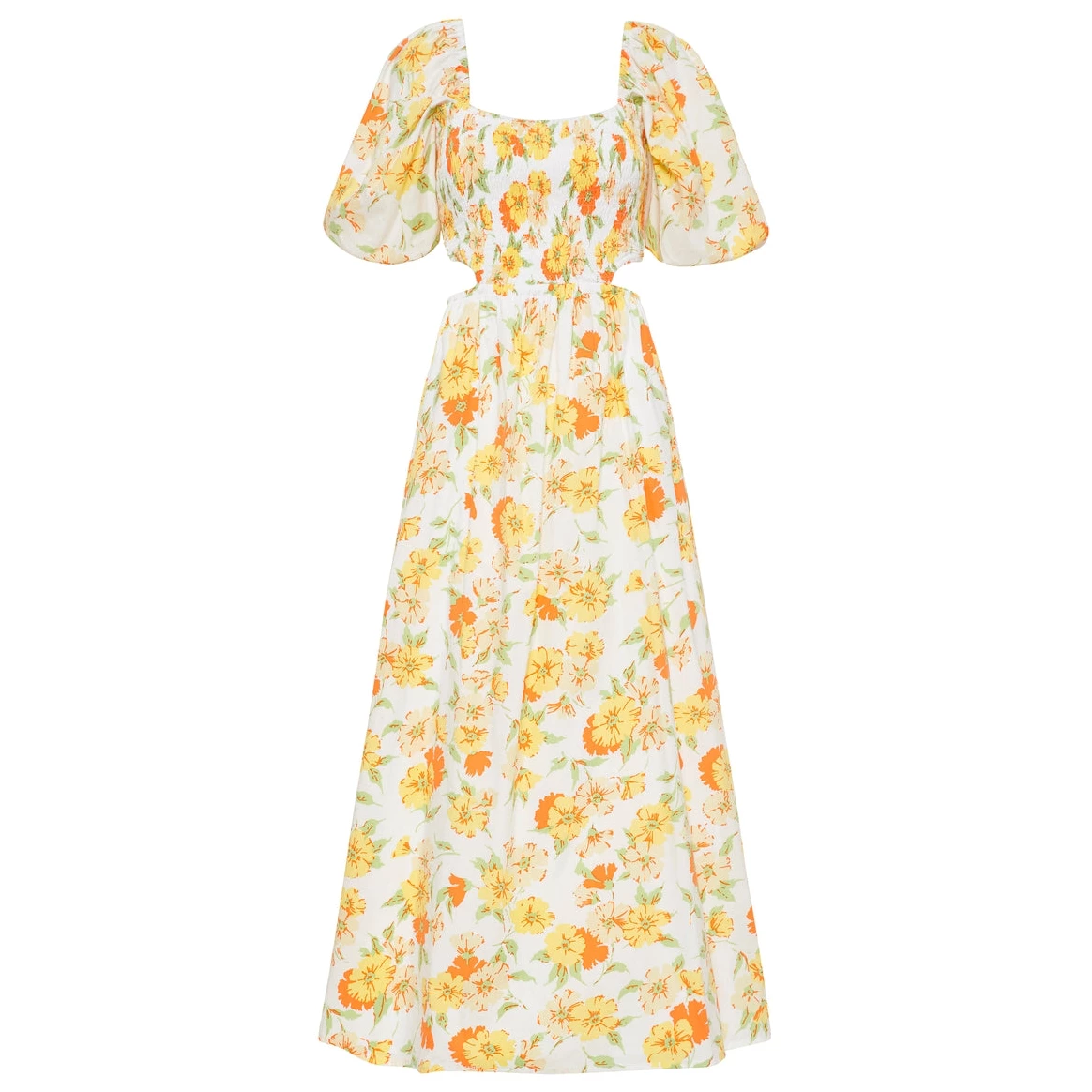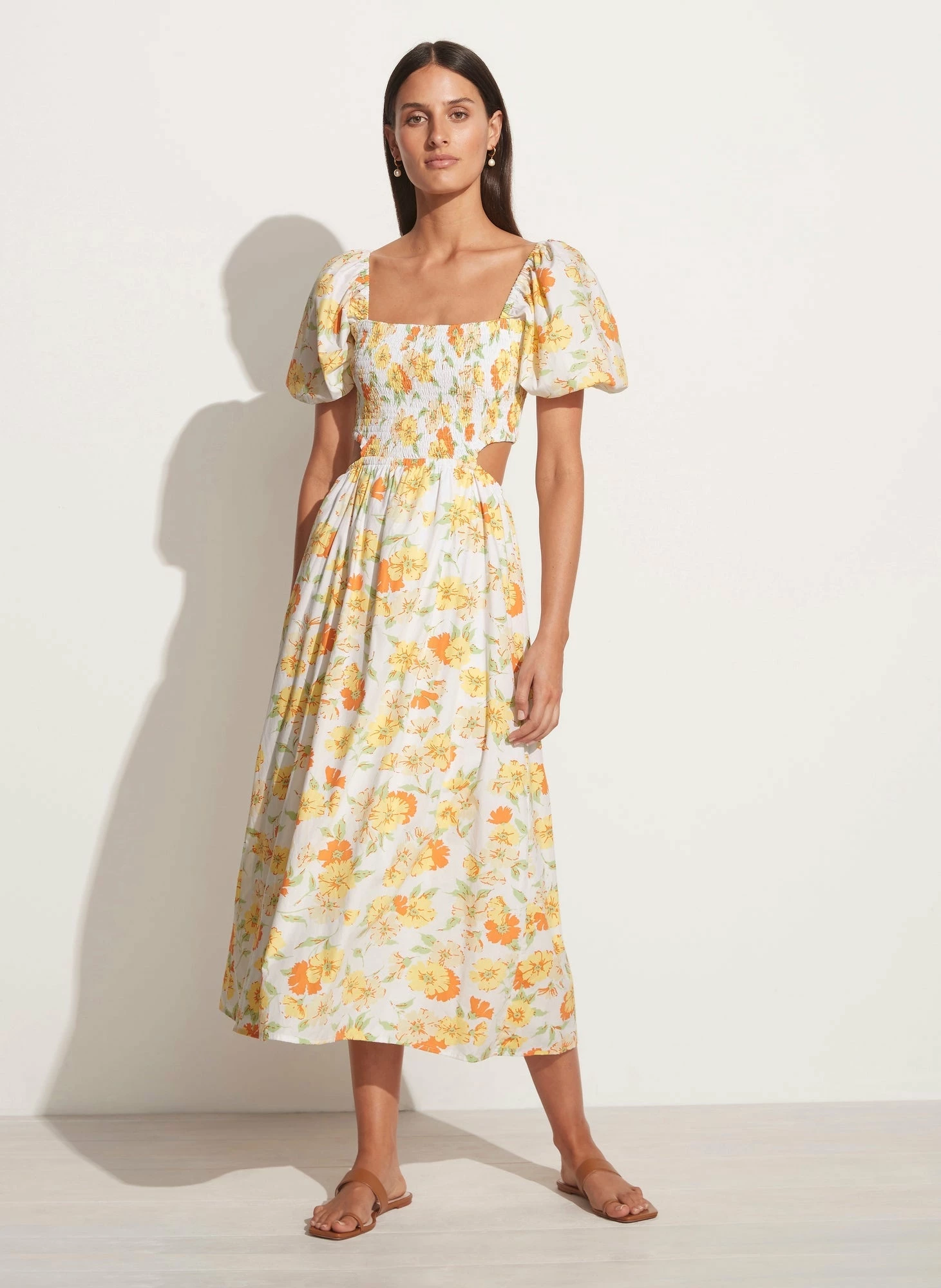 Featuring a square neckline, shirred bodice, and a flattering cutout detail on the waist, the feminine Loucetta Midi Dress is a must-have for summer soirees. Offering a classic silhouette with elasticated puff sleeves and a gathered midi skirt, this fully lined garment is cut from a crisp, lightweight Cotton Voile – OEKO-TEX100® Certified fabrication and hand-dyed in the romantic Palermo Floral Print.