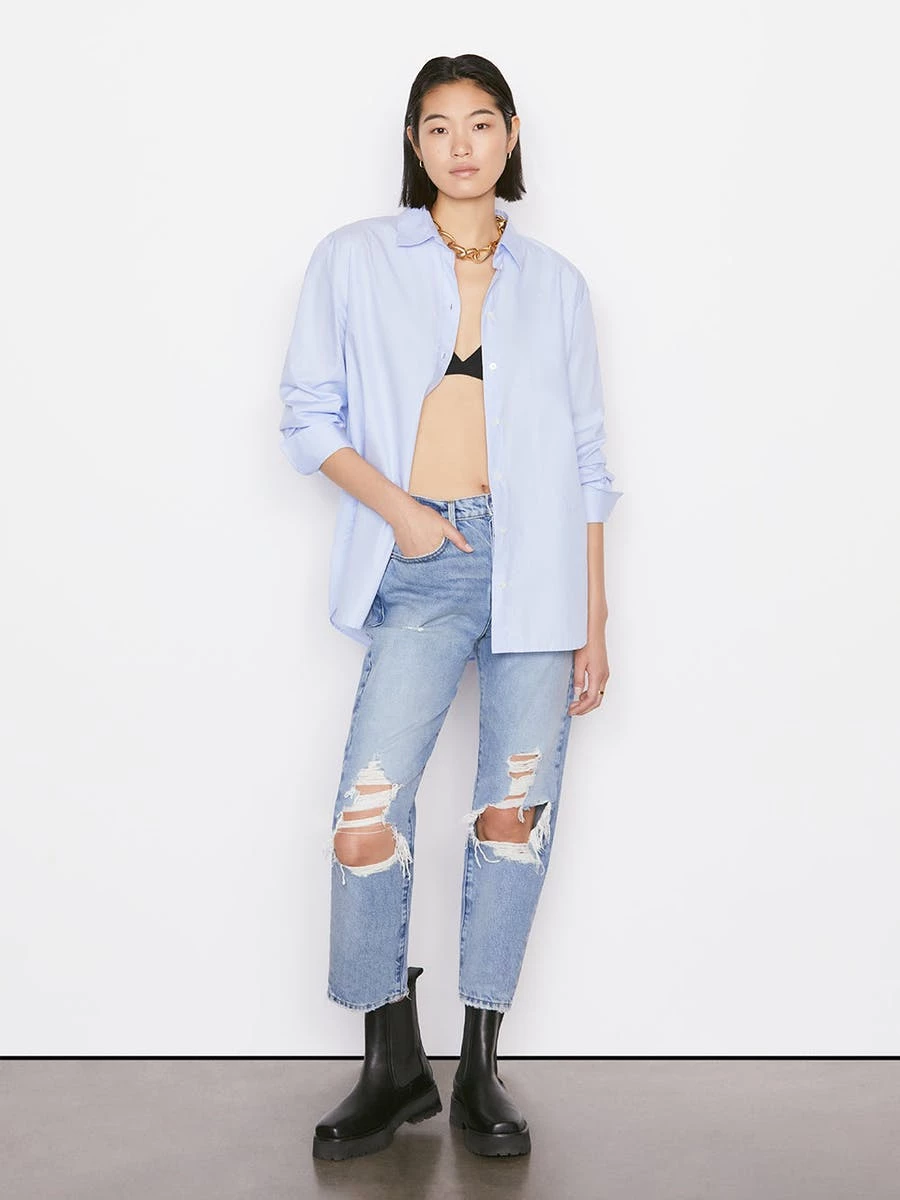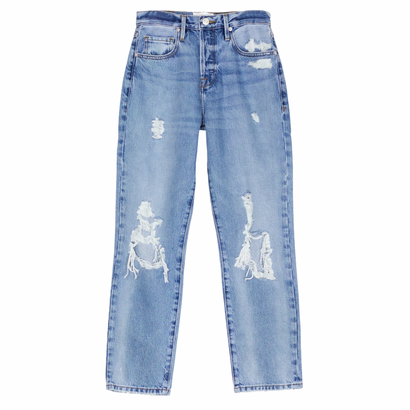 Le Original is a FRAME cult-favorite for vintage-inspired style, featuring a slim straight-leg and a high-rise waist that cinches in for a curve-enhancing silhouette. Broken-in with fading through the thighs, ripped knees, and destruction at the waist and pockets, Sunkissed adds an edgy-chic allure to any look.