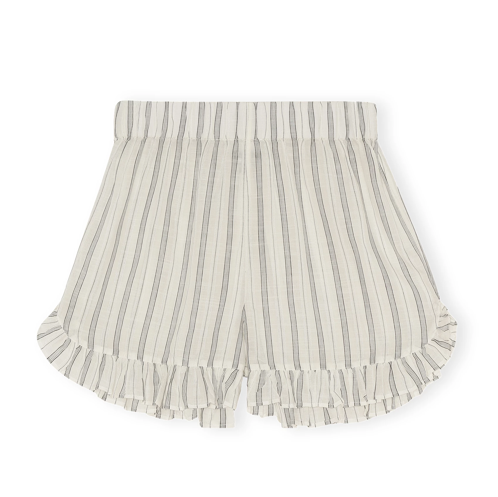 These are easy shorts in cotton suiting, finished with a unique elasticated waistband with a matching scrunchie-like gathered tie.