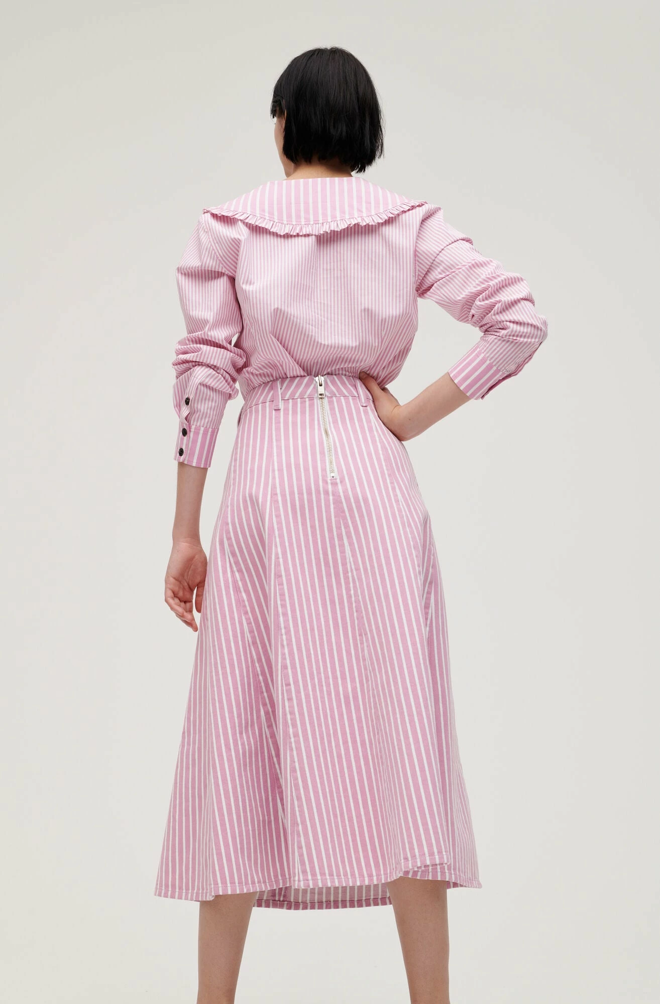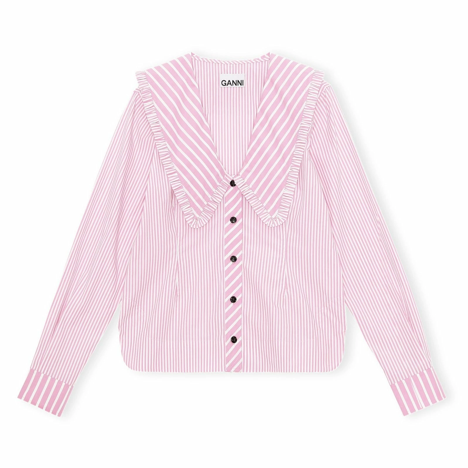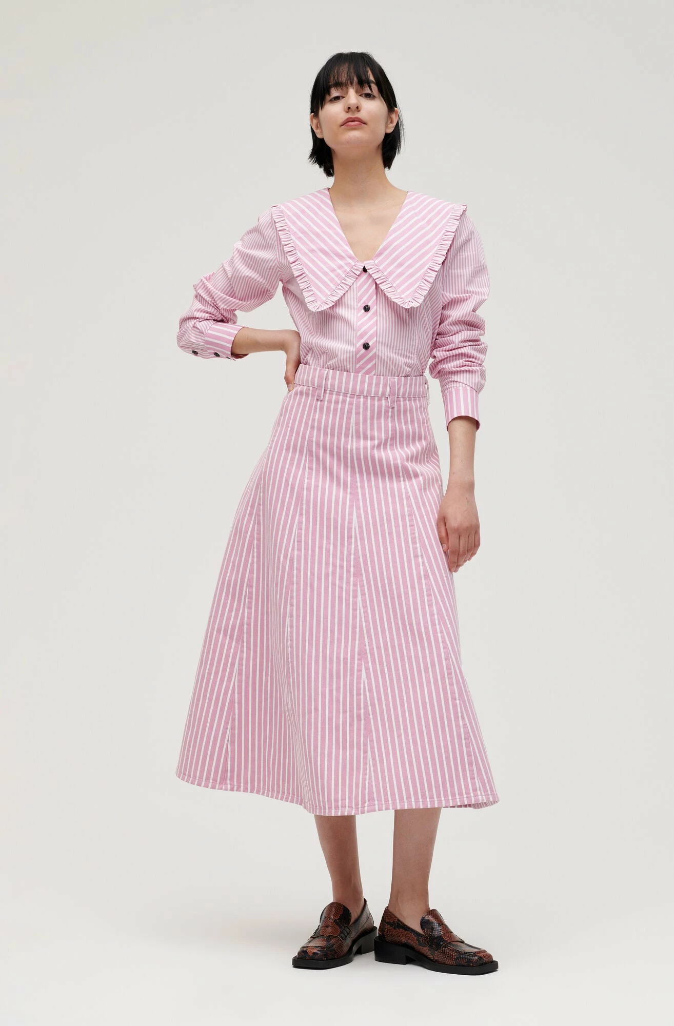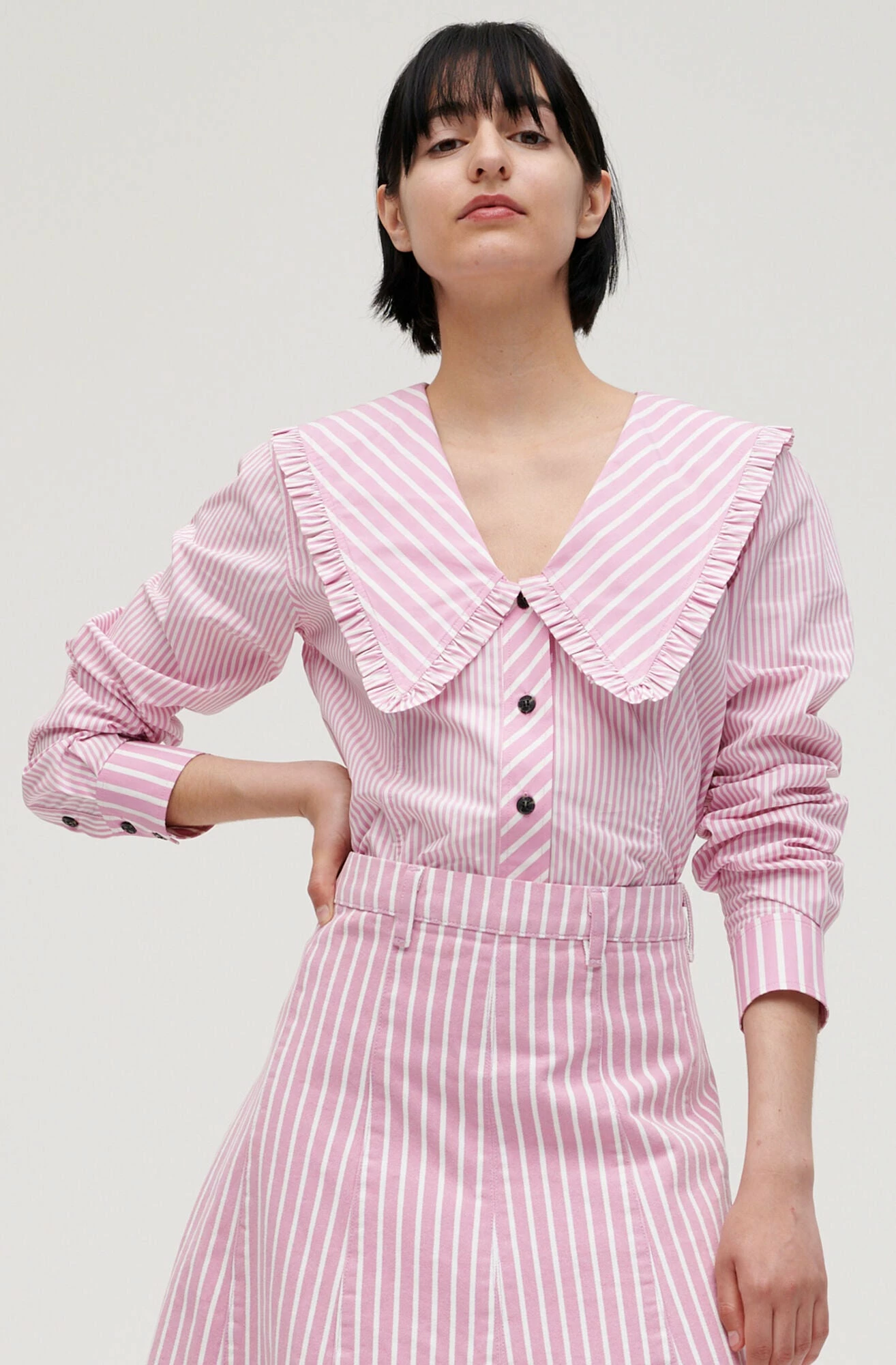 This crisp shirt in striped cotton features long subtle balloon sleeves and an oversized v-neck ruffled peter-pan collar.