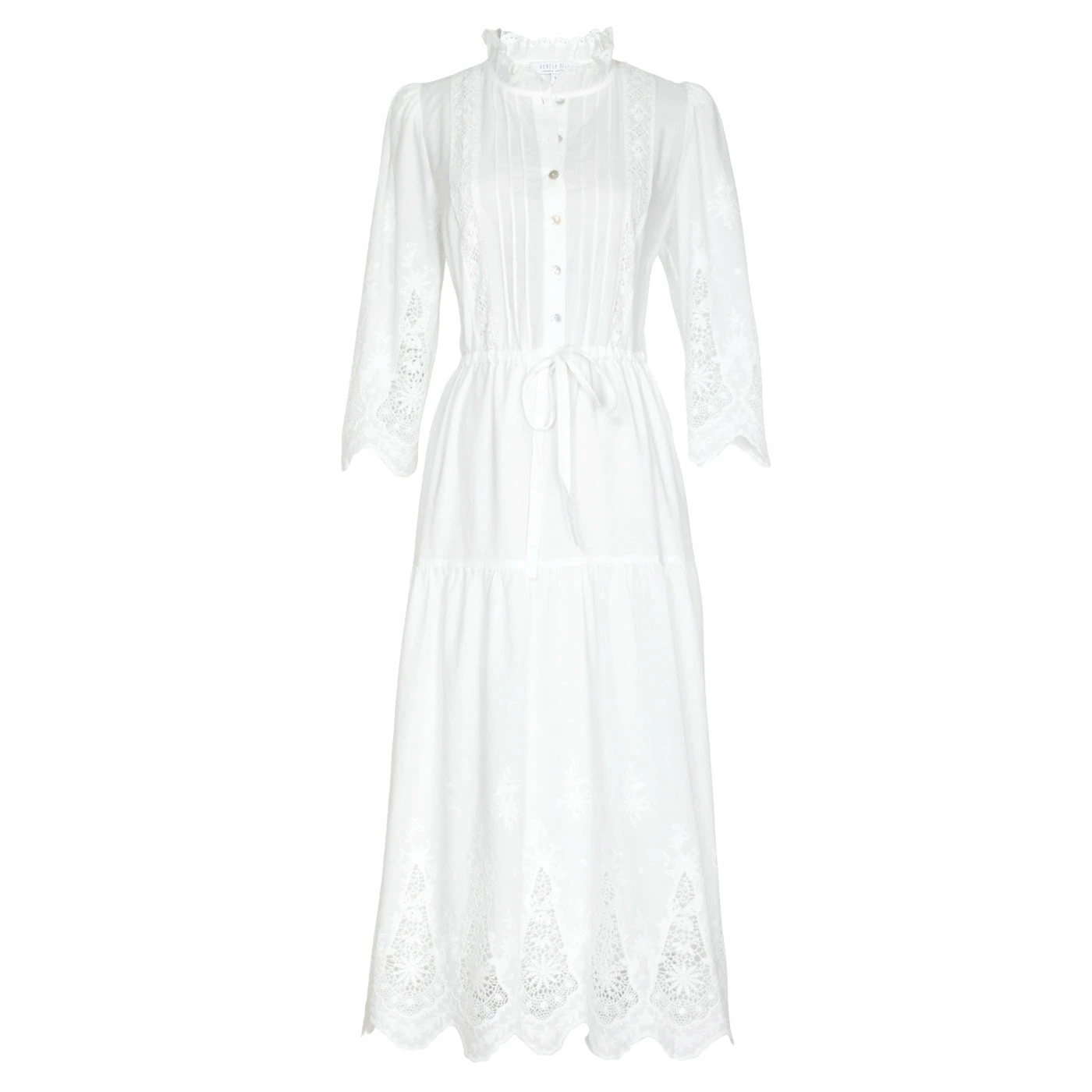 Benedict features an embroidered cotton voile that creates a whimsical look, while the adjustable drawstring waist, midi length, and 3/4 length sleeves create a more modern silhouette.