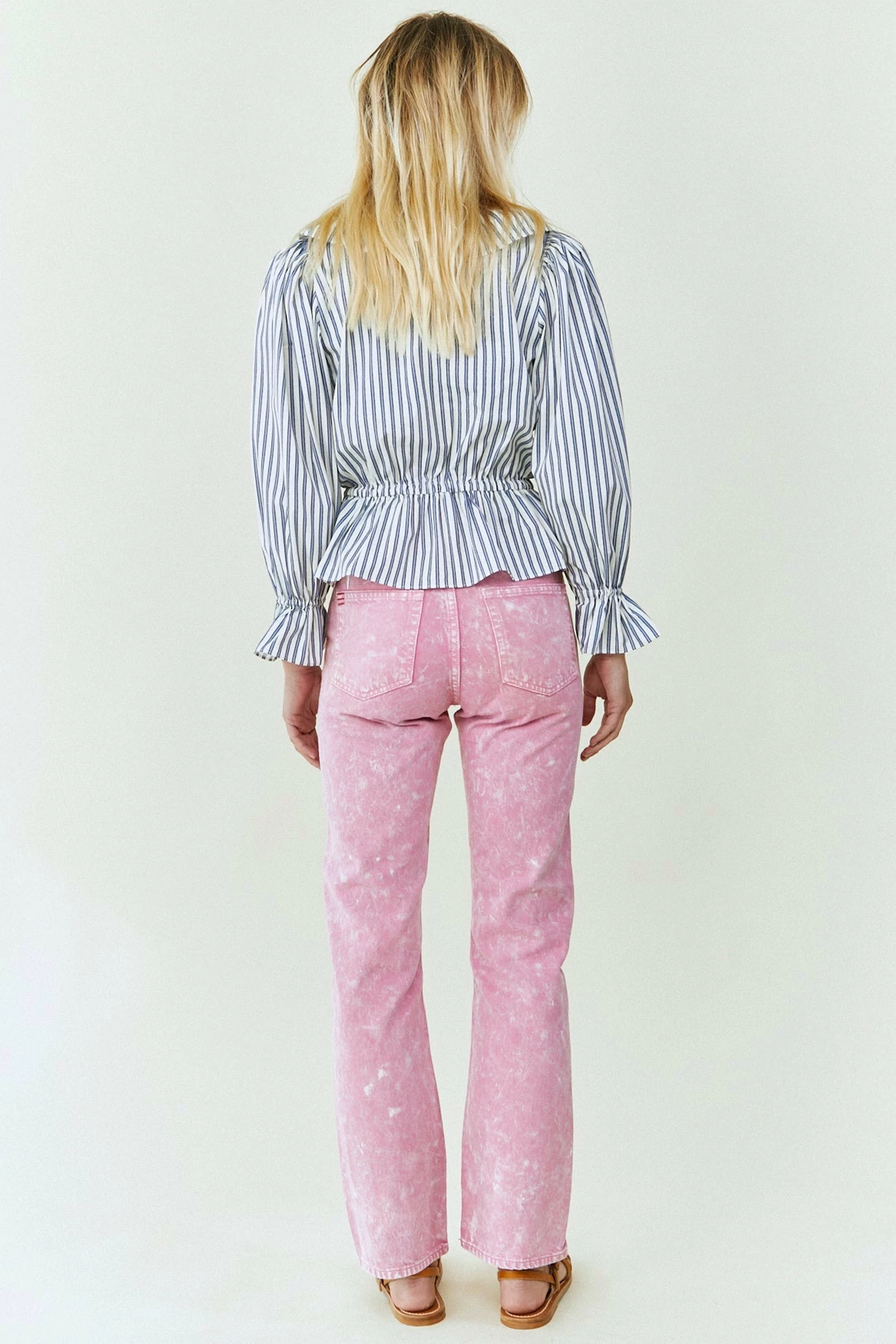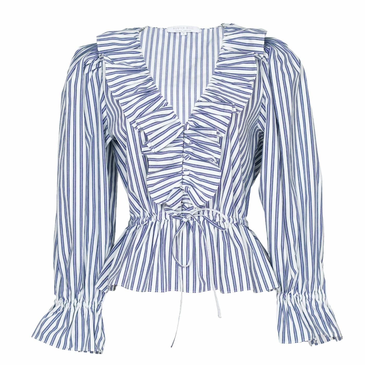 This top is a modern take on a classic preppy blue and white top. A deep ruffled v neckline and drawstring peplum create a universally flattering silhouette.