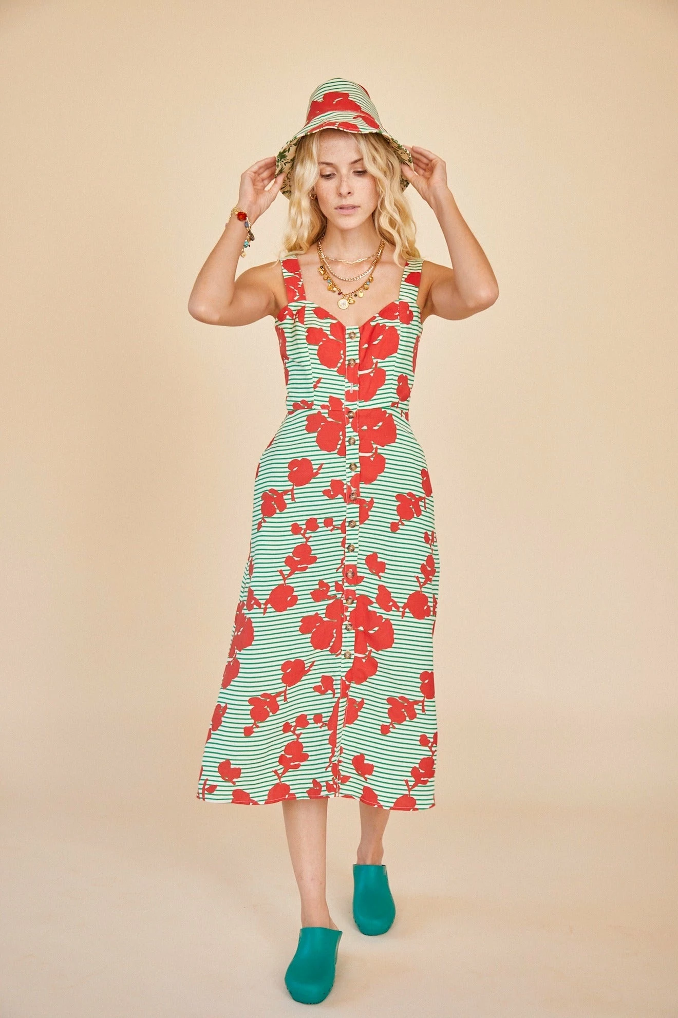 The Nellie Dress features a tailored bodice and A-Line skirt, the sweetheart neckline and front button placket complete the look of this youthful yet sophisticated silhouette.