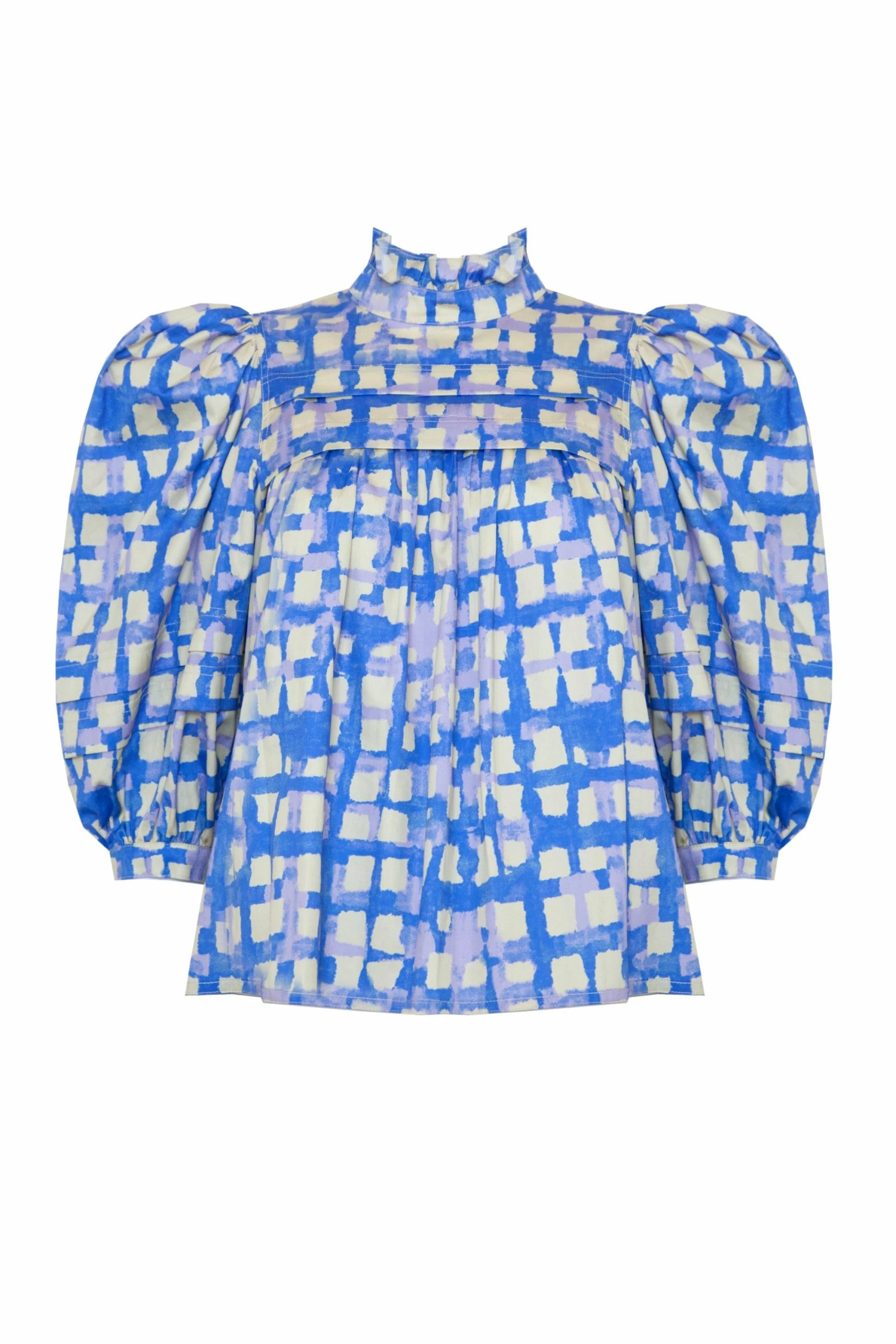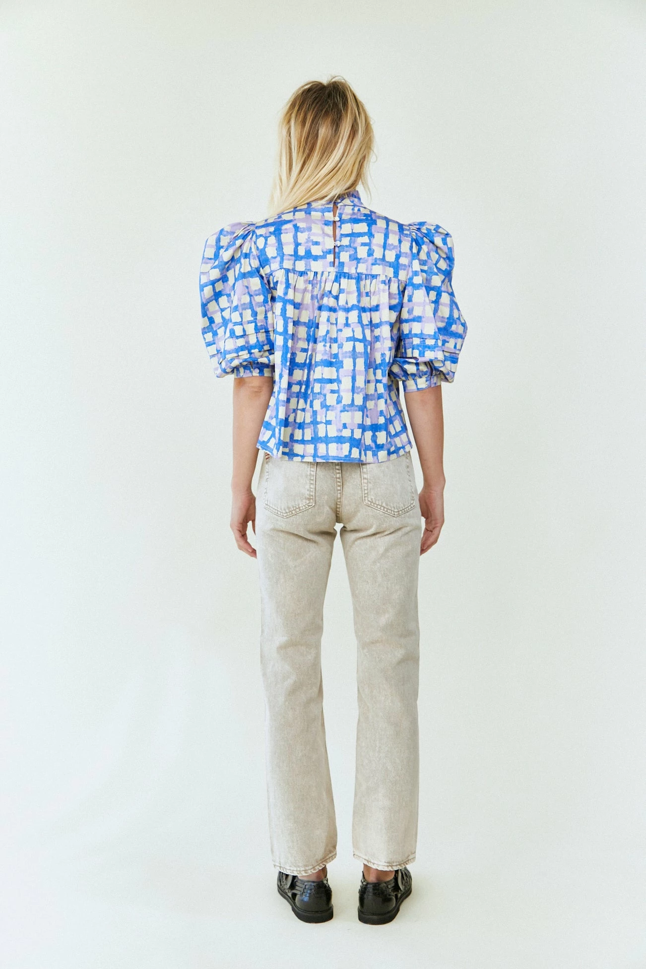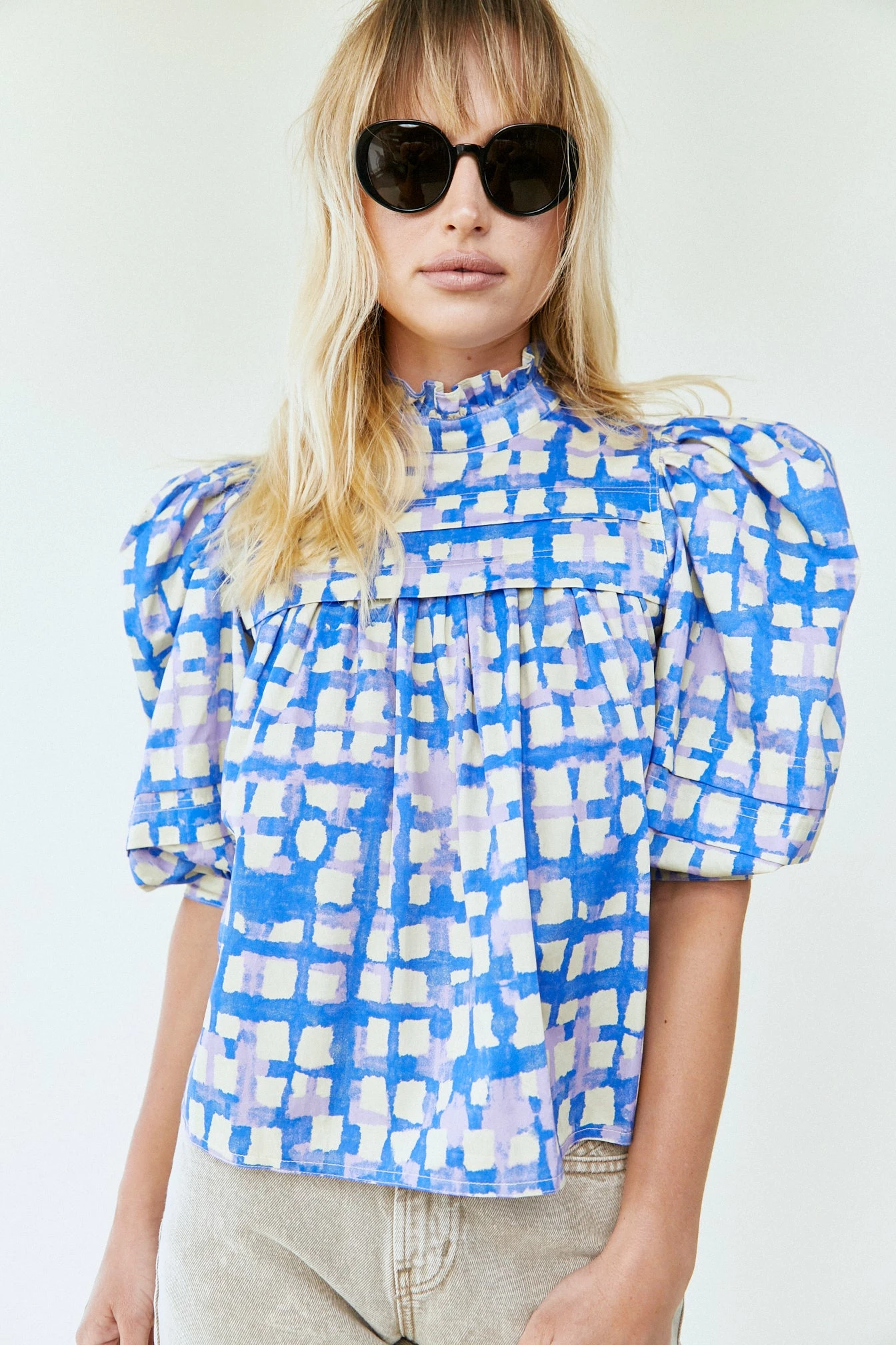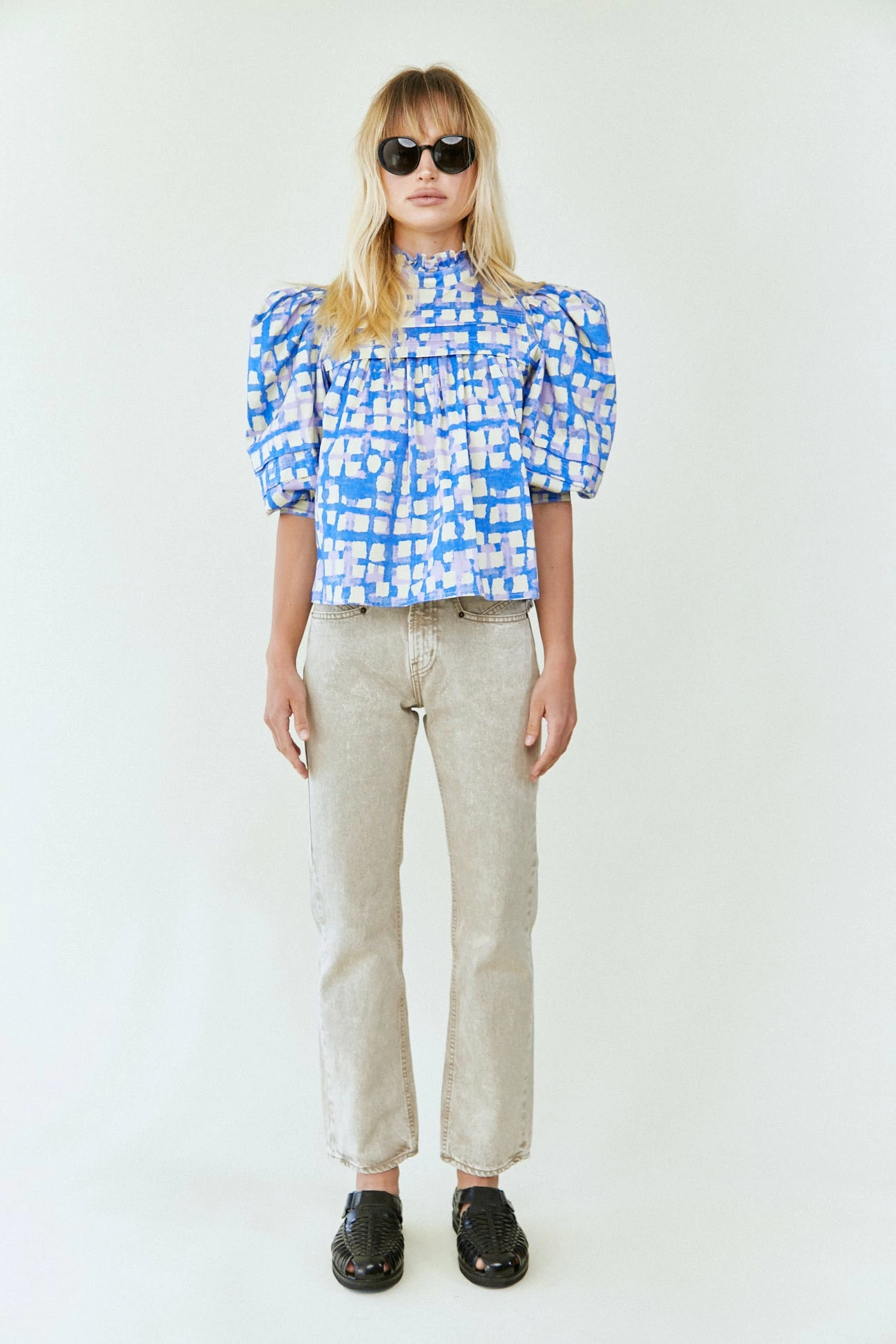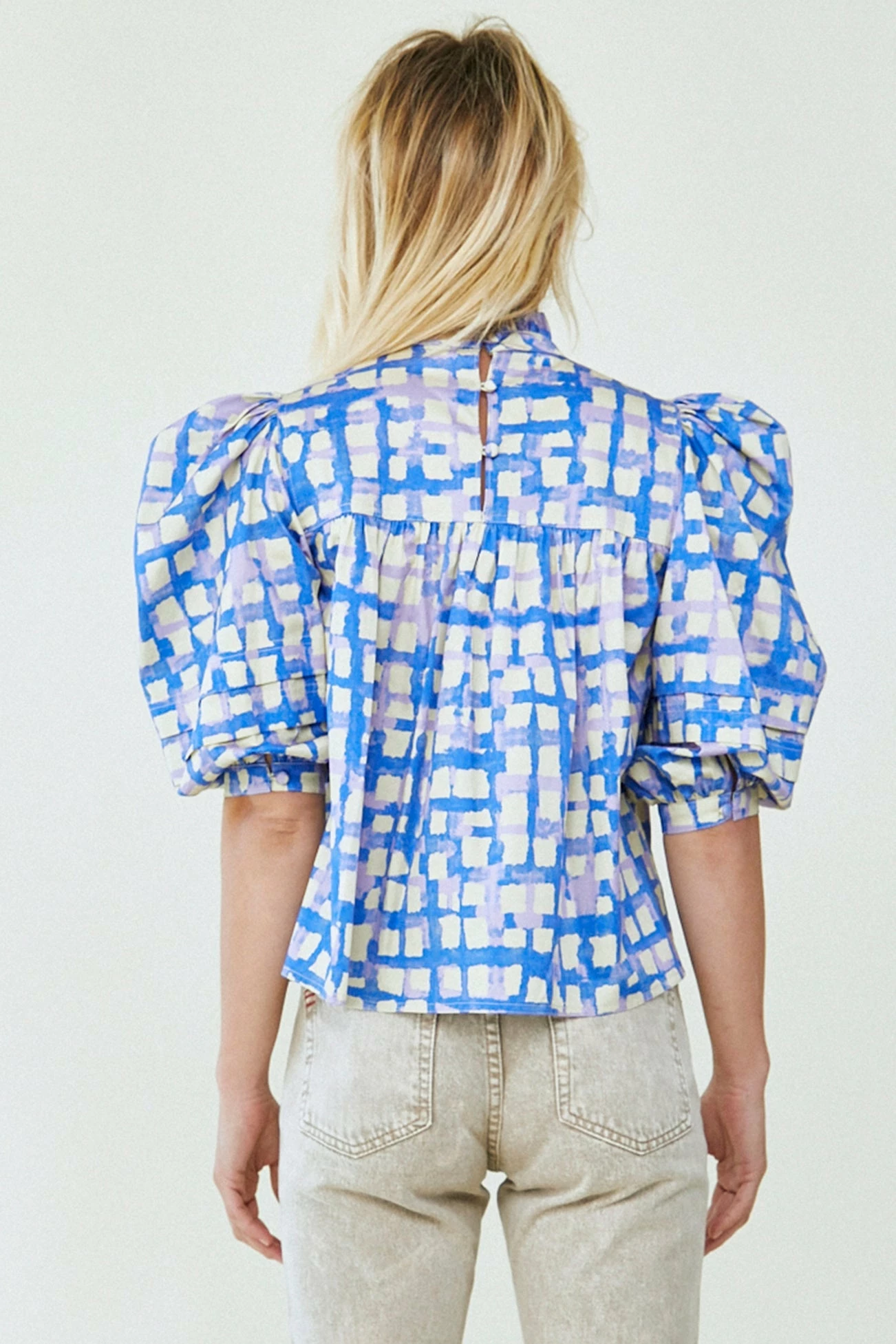 Featuring double pleats at the upper bodice, a ruffle mock neckline and dramatic elbow length puff sleeves, the Sofia top is born to shine.