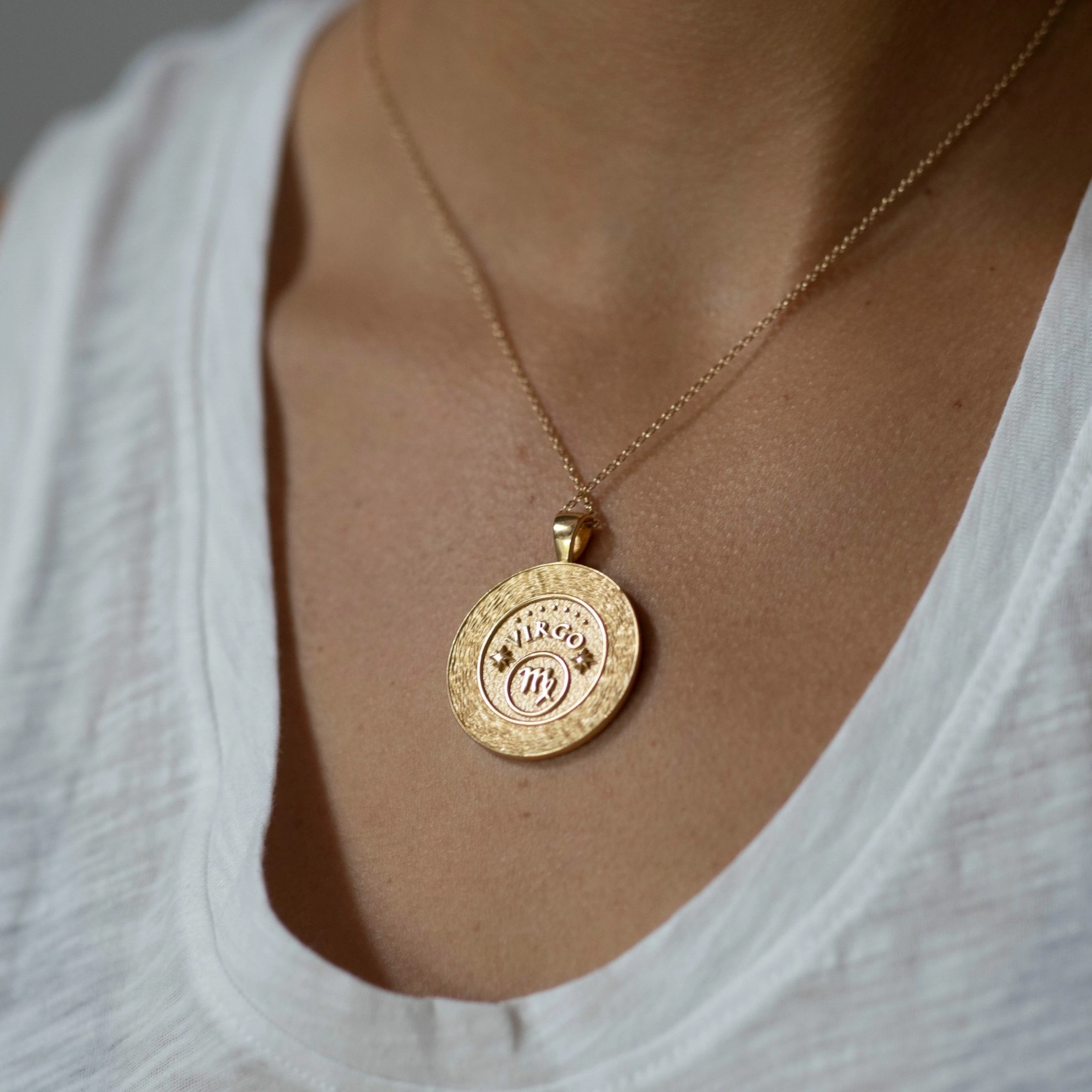- Coin pendant made of sterling silver dipped in 14k gold, measuring 1.2” in diameter.