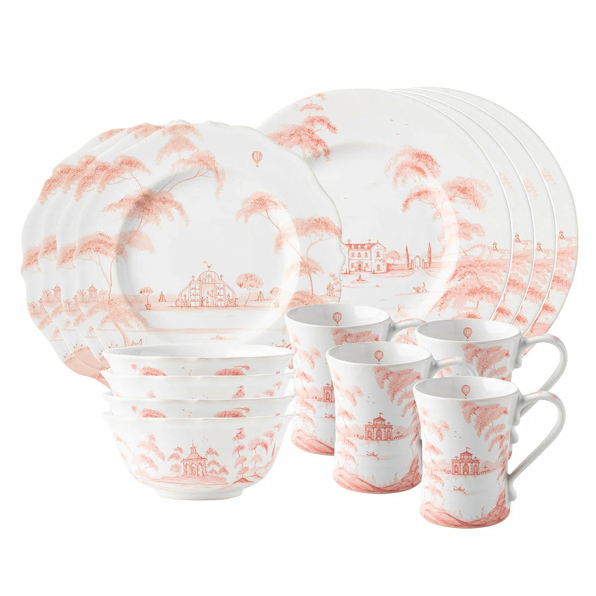From our Country Estate Collection – Featuring narratives of the English Countryside, our 16 piece setting in festive ruby red provides service for four and includes 4 dinner plates, dessert/salad plates, cereal/ice cream bowls and mugs.