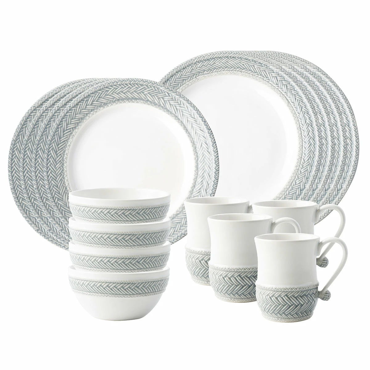 Inspired by the French basket weave often found in equestrian and nautical traditions, this textured woven border is beautifully hand-painted in a neutral grey-wash. This 16 piece set boasts service for four, and contains 4 dinner plates, dessert/salad plates, cereal/ice cream bowls and mugs.