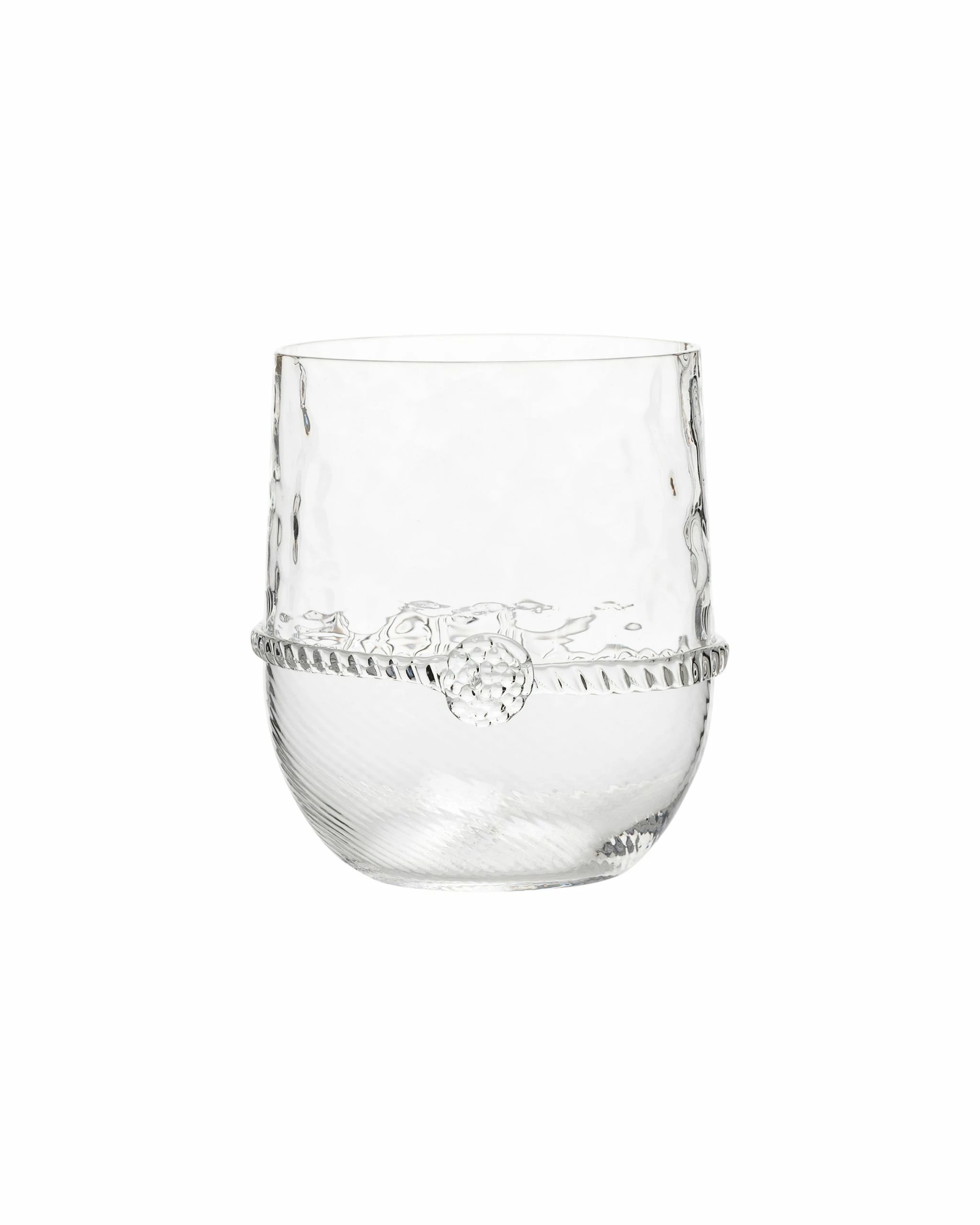 From the Graham Collection. Wonderfully adaptable for water, juice or cocktails, this tumbler glass feels great in the hand and makes a handsome statement in any setting thanks to its spiral optic and hammered glass treatment.