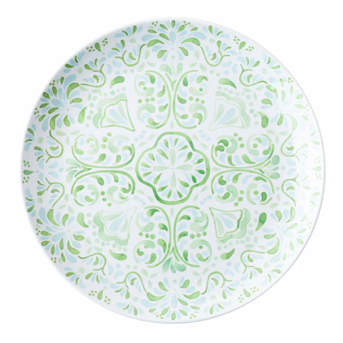 The beguiling pattern of this dinner plate was inspired by the intricately painted tiles we found on an escapade to the Iberian Coast. Made of sturdy melamine and featuring a verdant palette of soft sage and sky blue hues that are both refreshing and soothing – you will want to use this gorgeous green plate everywhere, indoors and out.