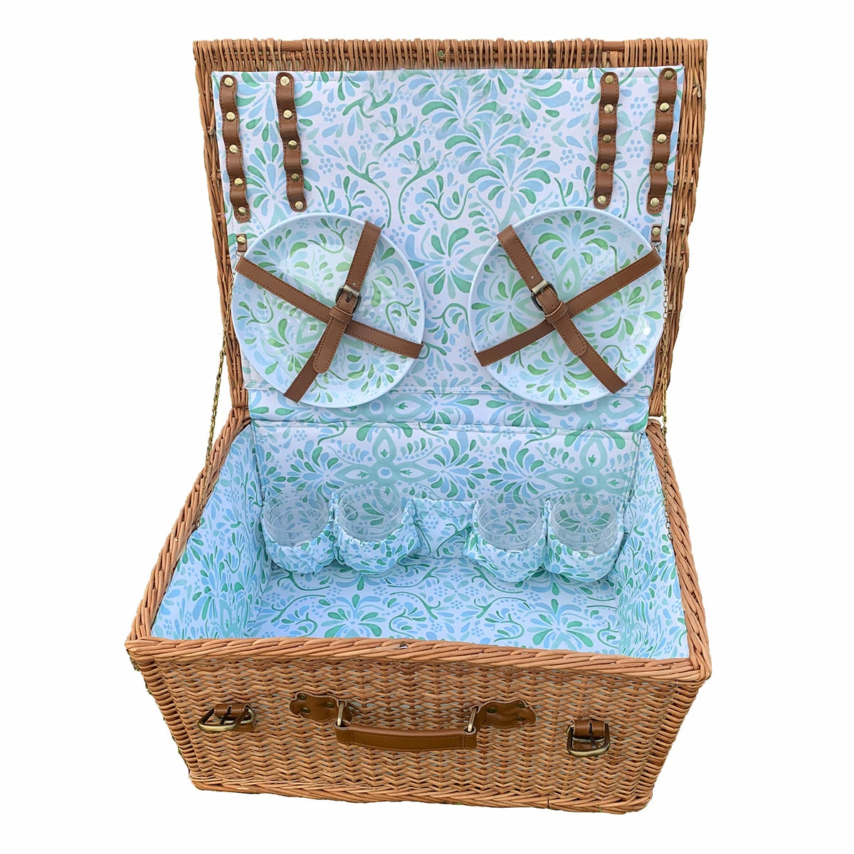 There’s nothing more romantic than a picnic! Plan one now and whisk your loved one off for an unforgettable experience. Expertly crafted in rattan with durable leather straps and lined with our Iberian Sage pattern, this picnic basket comes equipped with service for 4 in our Iberian Sage melamine salad plates and Isabella clear tumblers.