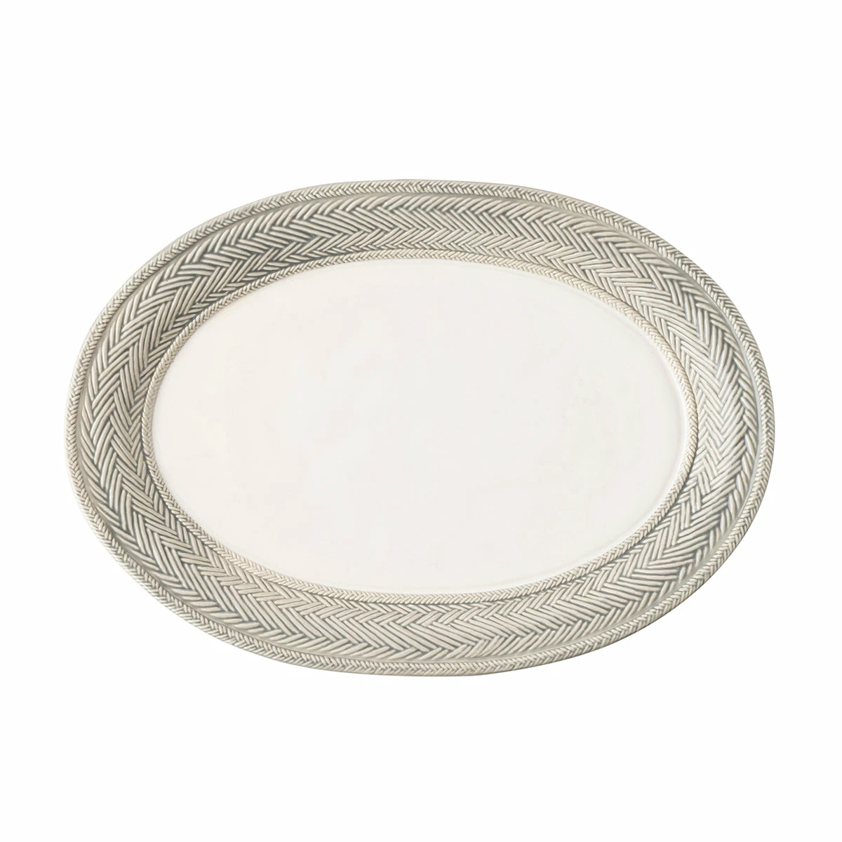 The large scale of this basket-weave motif instantly evokes the bounty of the earth and echoes of its harvest. Richly textural and featuring a handsome, hand-painted grey wash trim, this platter will serve up your superstar dishes with elegant ease.