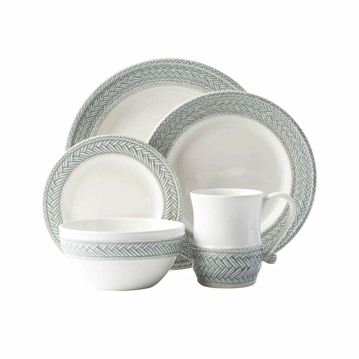 Inspired by the French basket weave often found in equestrian and nautical traditions, this textured woven border is beautifully hand-painted in a neutral grey-wash. This 5 piece place setting contains a dinner plate, dessert/salad plate, side/cocktail plate, cereal/ice cream bowl and mug.